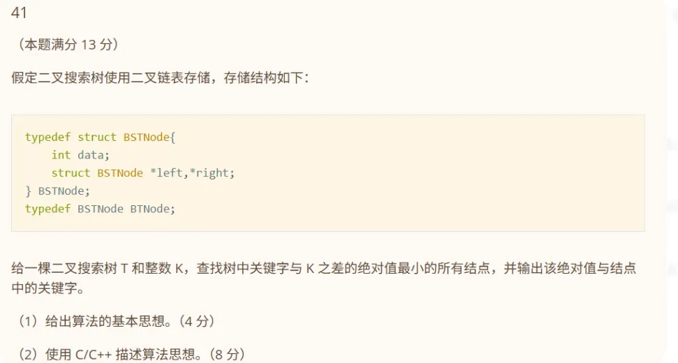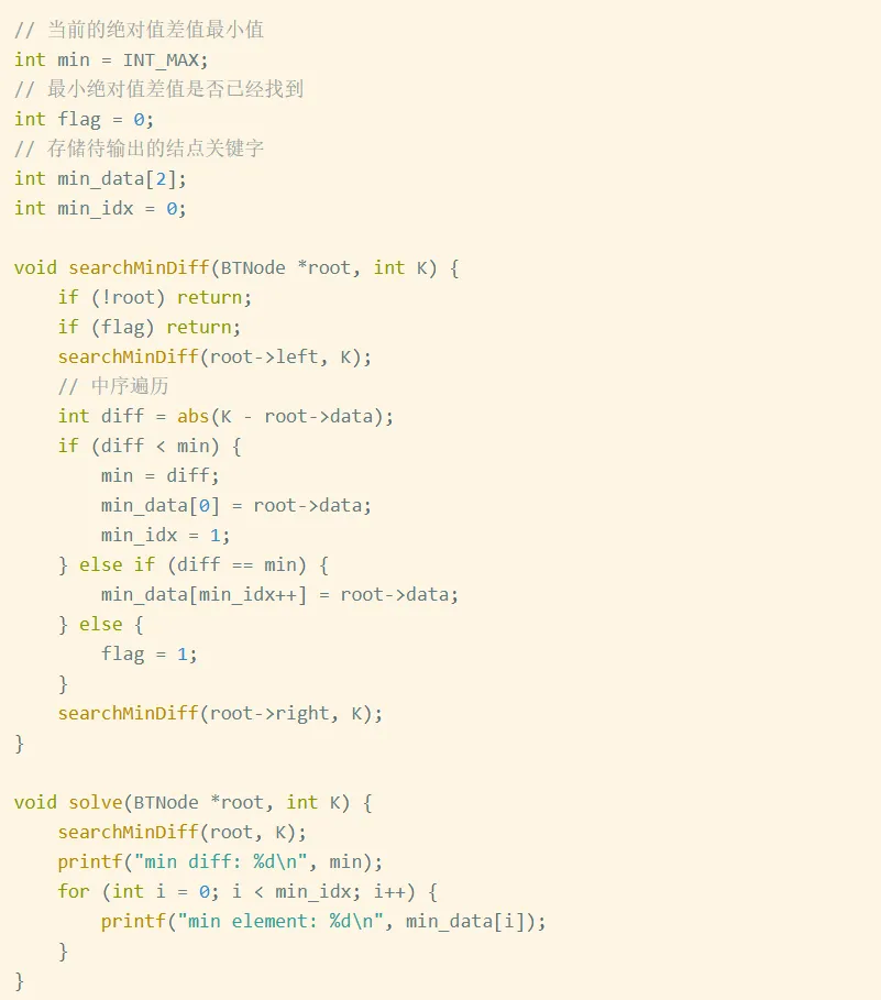 题目给定了一棵二叉搜索树和一个整数 k,让我们去这棵树里面找到哪一个节点的值和 k 最接近,也就是差的绝对值最小。如果有多个节点满足条件,都需要找出来。最后我们需要输出这个最小的差值和对应的节点数值。