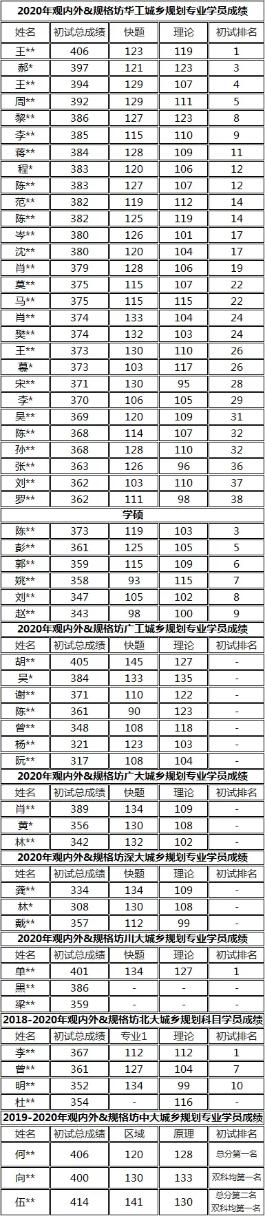 400分以上共6人,规格坊占4个席位。前32名(34位)中,规格坊占24个席位。28人进复试,规格坊学员19人。拟录取19人,规格坊学员占据14个席位,占比73.68%。其中规划方向录取13人,9人为规格坊学员,景观方向录取6人,5人为规格坊学员。