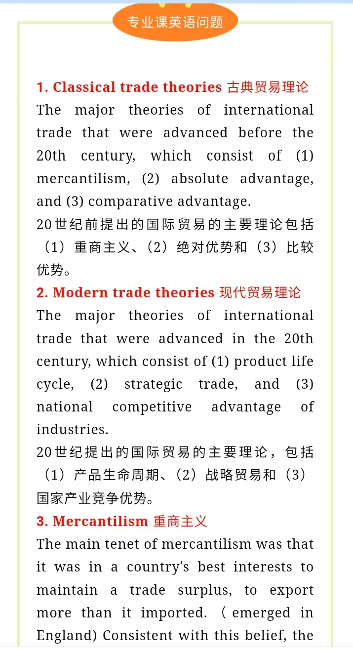 精选国际商务高频考点词汇(如国际贸易、重商主义、外汇市场、关税壁垒等),搭配复试常用短语及固定表达,方便背诵记忆,避免出现“词不达意”的尴尬。