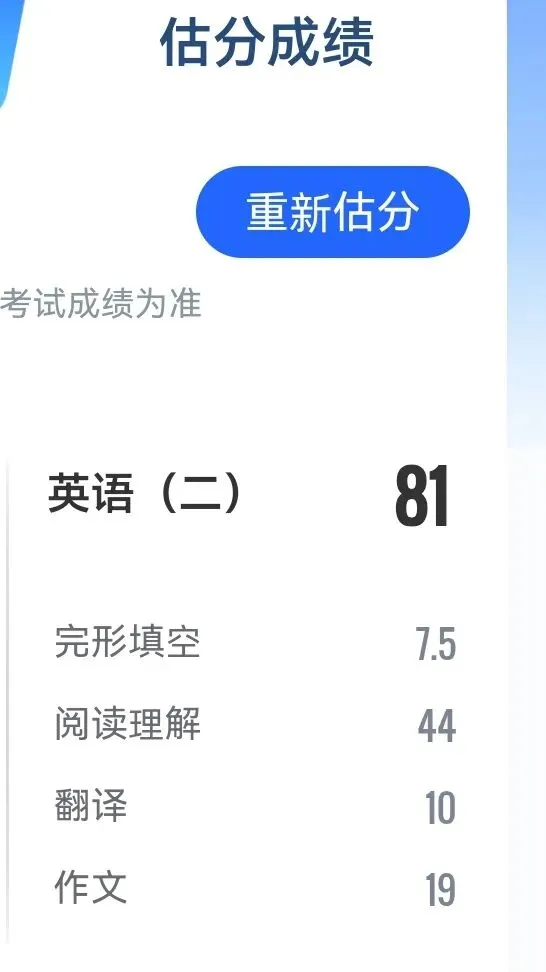 昨天查了初试成绩,不出意外英语比我预估分数只低1分,而且成绩不赖,达到80分。