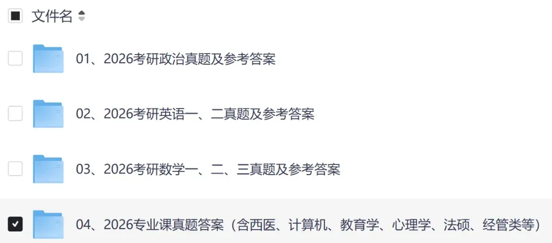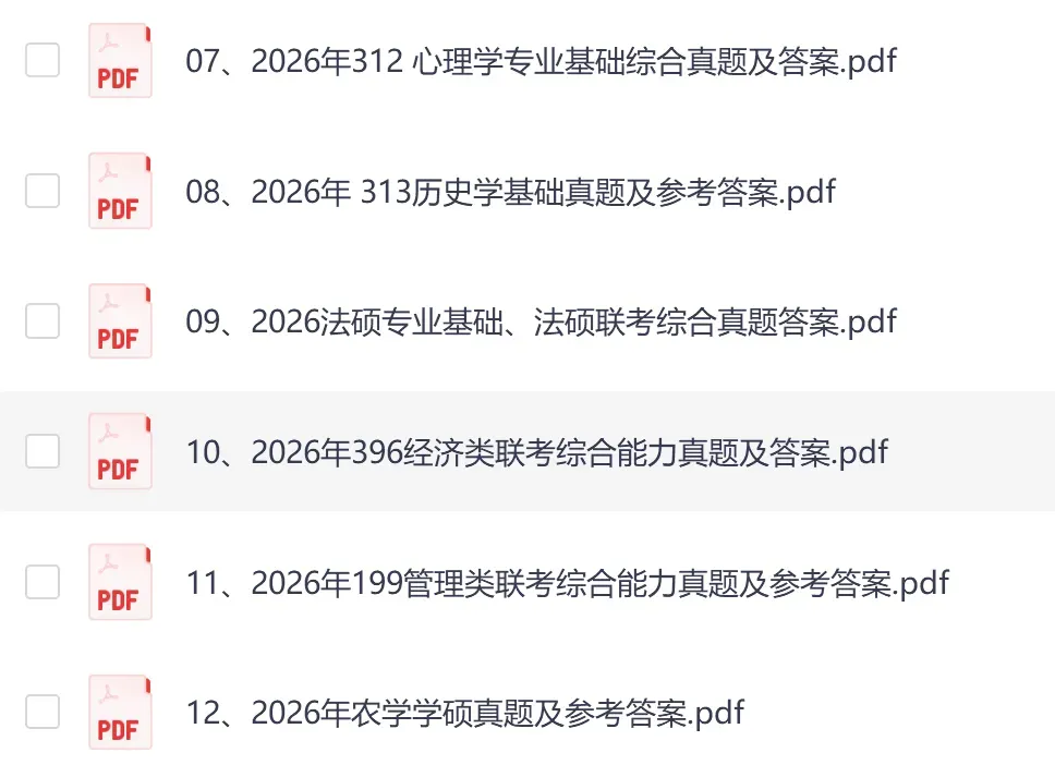 9、2026年398/397法律硕士专业基础(非法学/法学) 与 498/497法律硕士综合(法律专硕联考)真题及参考答案10、 2026年396经济类联考综合能力真题及答案12、2026年314/315数学/化学(农) 与 414/415植物/动物生理生化(农学学硕联考)真题及答案。