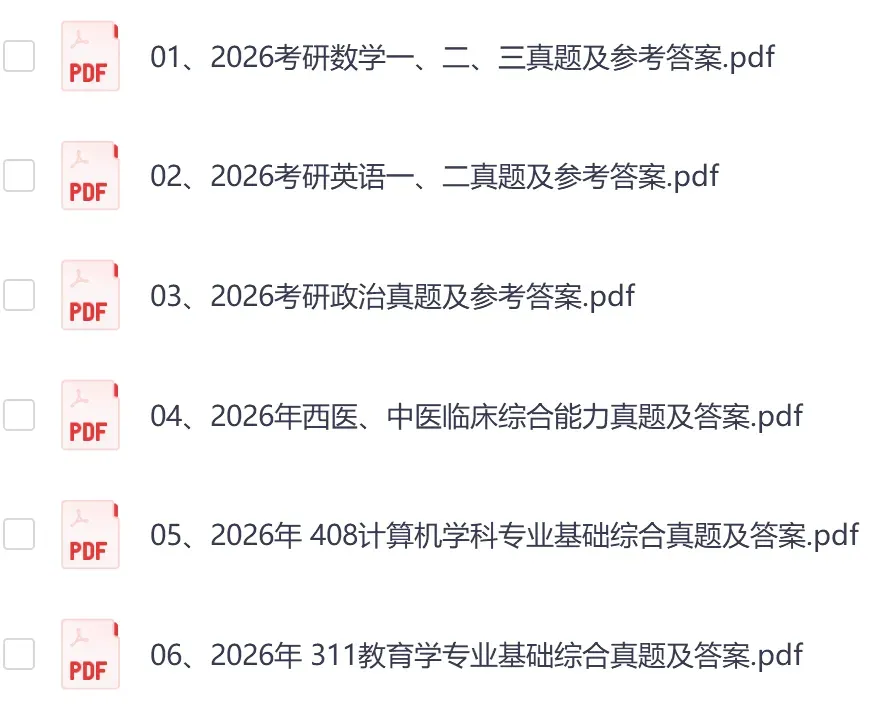 各位小伙伴考研结束,大家发挥的怎么样?希望2026年考研的同学都能一战成硕!今天给大家准备的是:2026考研英语、数学、政治、专业课真题及答案(完整版)。包含:1、2026年考研英语一、英语二真题及参考答案(完整版)2、2026年考研数学一、数学二、数学三真题及答案(完整版)