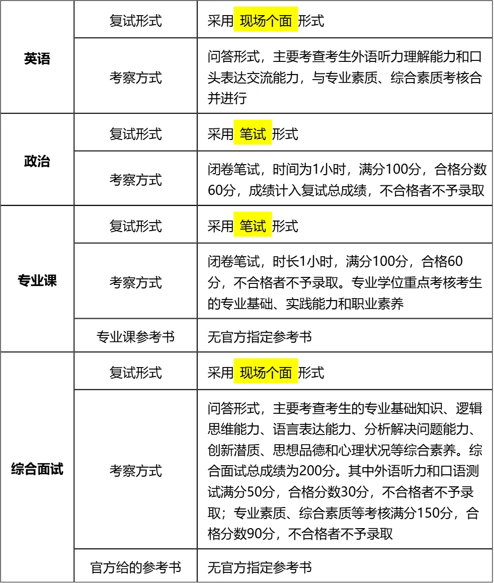 老师大白话分析:政治和专业课均为闭卷笔试且有合格线,需重点准备;英语听说和综合面试合并进行,既要提升口语表达,也要夯实专业基础和综合素质。无官方参考书,需结合真题和核心考点梳理复习内容。