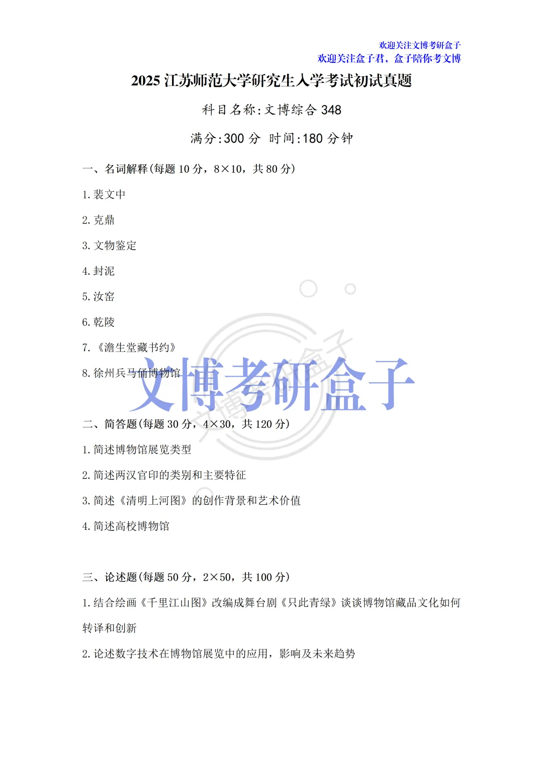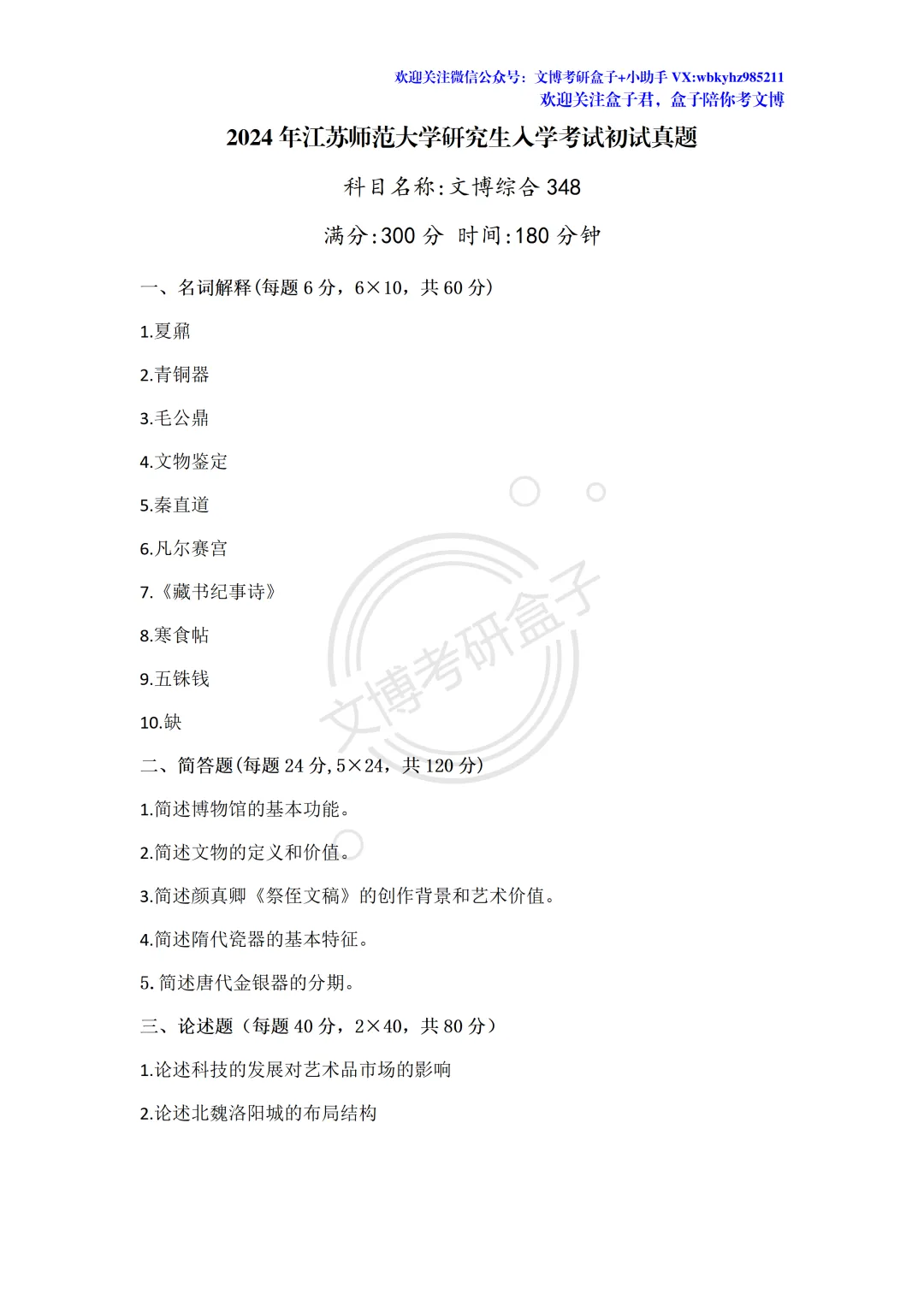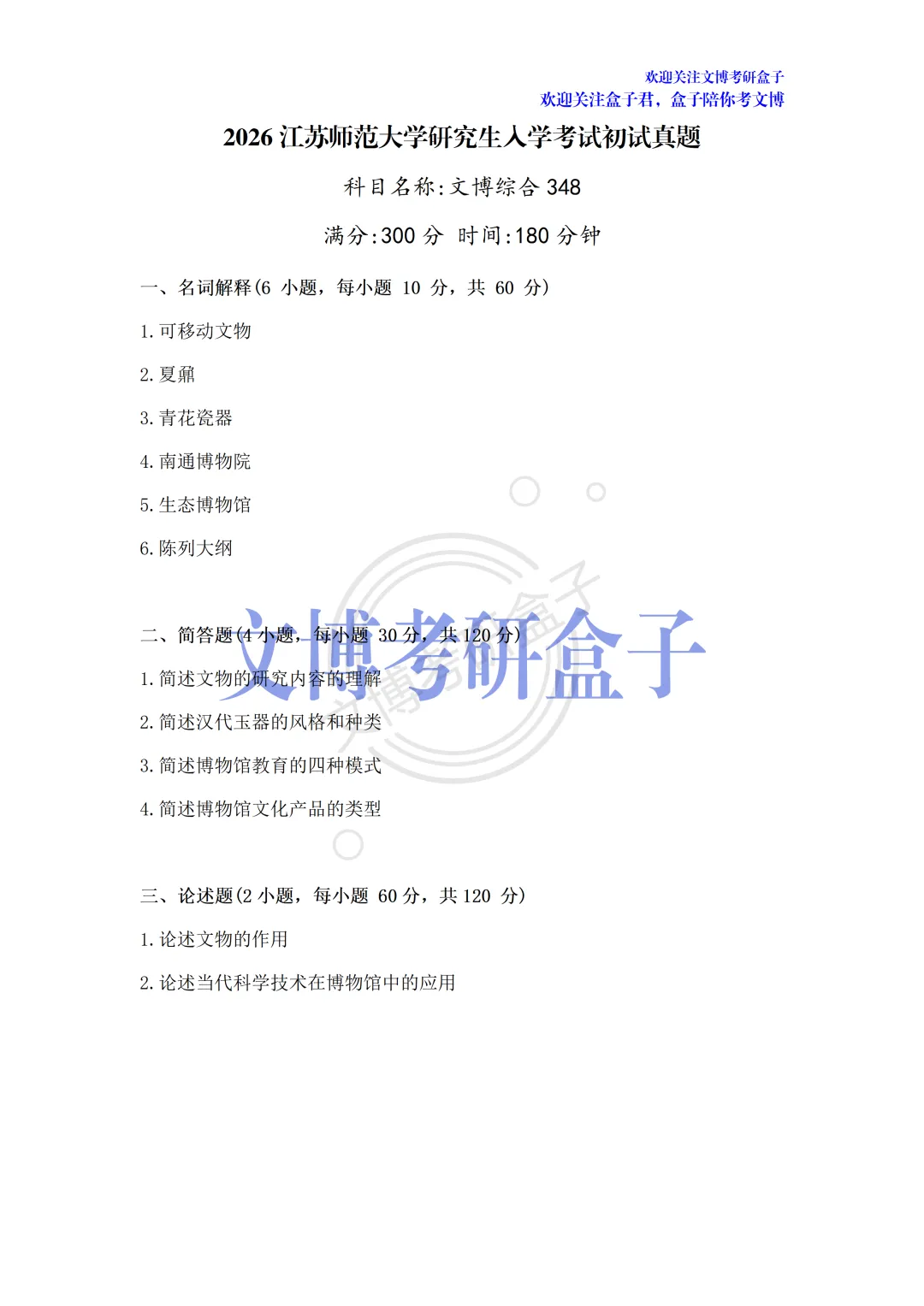 考试的盒子学员和盒友们凭借记忆带出考场的,是真题的回忆版,因此可能会有些许偏差,也会有部分院校的题目不全,但基本一致、十分宝贵!希望27文博考研的同学好好收藏保存!