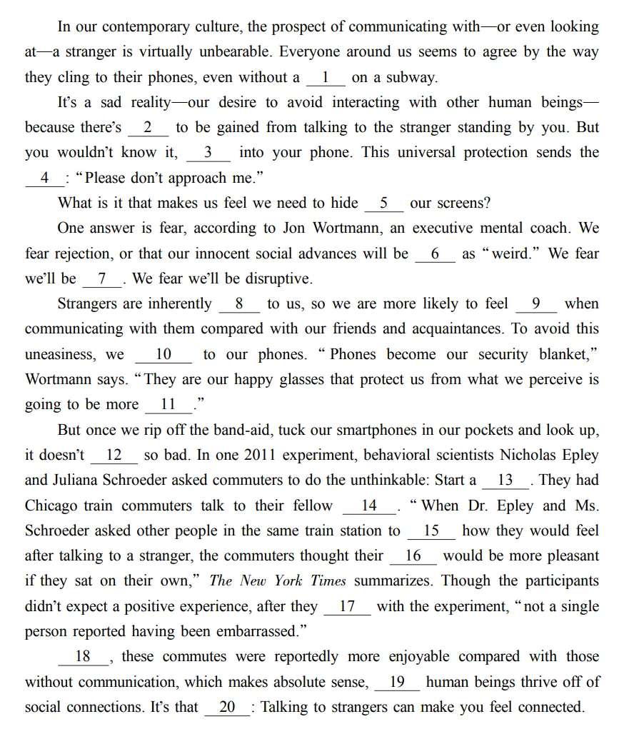注:plug 本义指“塞子”或“插头”,作动词时指“堵住”或“插入”。在 plug into your phone中,是比喻用法,意为“埋头盯着手机”,就像把自己“插”进手机里一样,与外界隔绝。