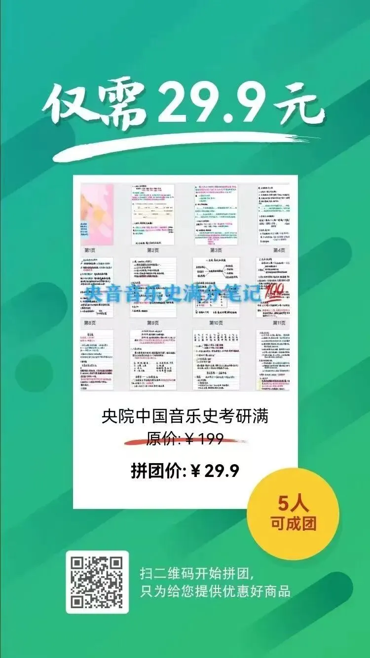 📒央院中国音乐史考研💯满分笔记,原价199一份,今天优惠拼团只要29.9元,优惠拼团请点击阅读原文或扫码下图二维码(拼团马上发放,请添加客服微信:bwv618):