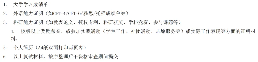 说明:以上材料将作为对考生既往学业、一贯表现、科研能力、综合素质和思想品德等情况全面考查的参考依据;考生必须保证材料真实准确,若弄虚作假,一经发现,立即取消其复试或录取资格。