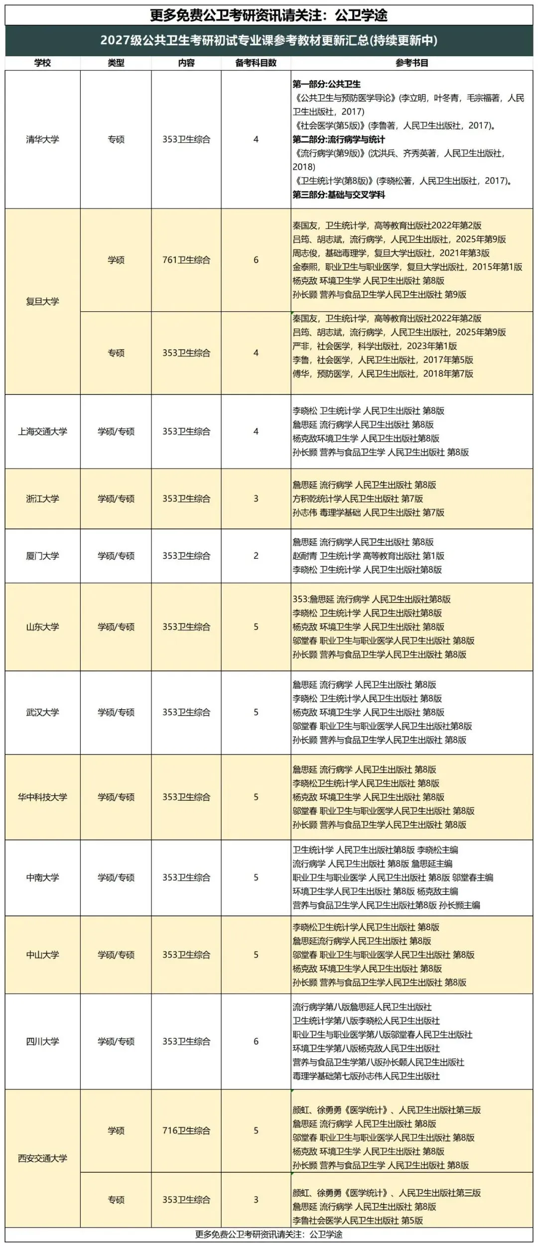 公卫考研的“内卷”战场上,信息差是决定成败的关键因素之一。而所有信息中,最基础也最致命的,就是专业课参考书目。同样的《卫生统计学》,有的学校用第八版,有的用人卫最新版,甚至有的学校暗中偏向本校的出版教材。版本没选对,努力全白费。为了帮助大家在繁杂的招生简章中快速定位复习核心,我们对比了全国数十所重点院校的最新招生目录,为你整理出了这份保姆级的公卫考研初试专业课参考教材汇总。请务必收藏好,对照你的目标院校,别再看错书了!