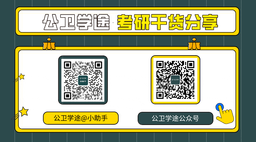 我们是复旦大学公卫学院学霸团队,这里有国奖学姐,有蝉联专业课第一的学霸,有高分上岸考神。用心分享公卫考研资讯,助力考生圆梦。点击上方“公卫学途”,选择“设为置顶or星标”