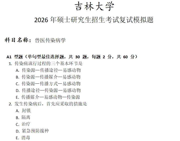 当前位置:首页>考研真题>吉林大学兽医传染病学考研复试真题模拟