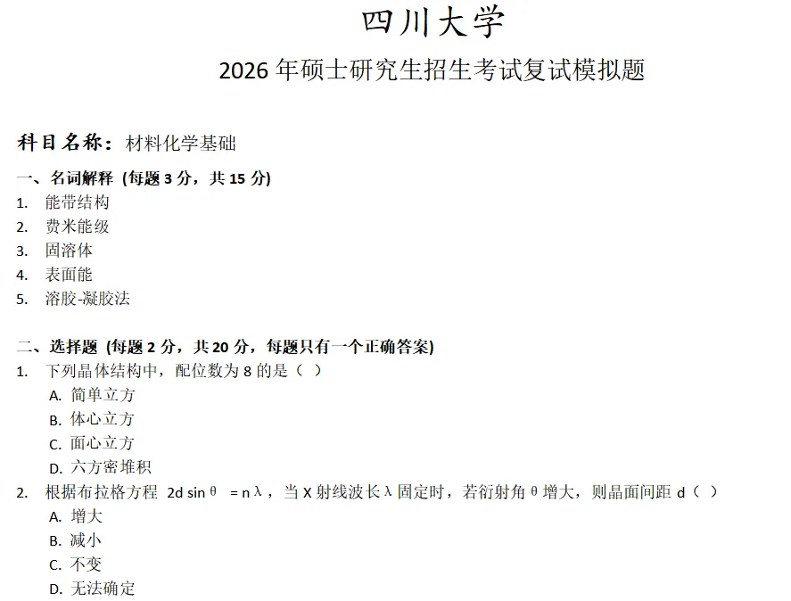 >四川大学材料化学基础考研复试真题模拟