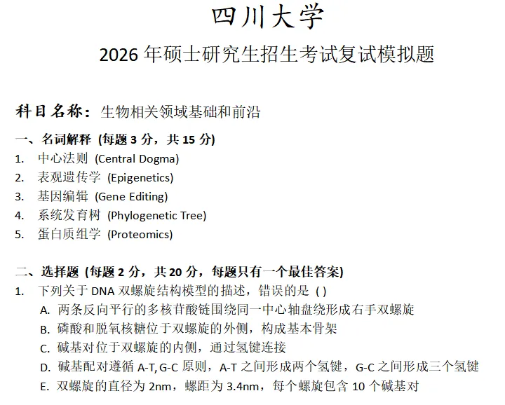 >四川大学生物相关领域基础和前沿考研复试真题模拟