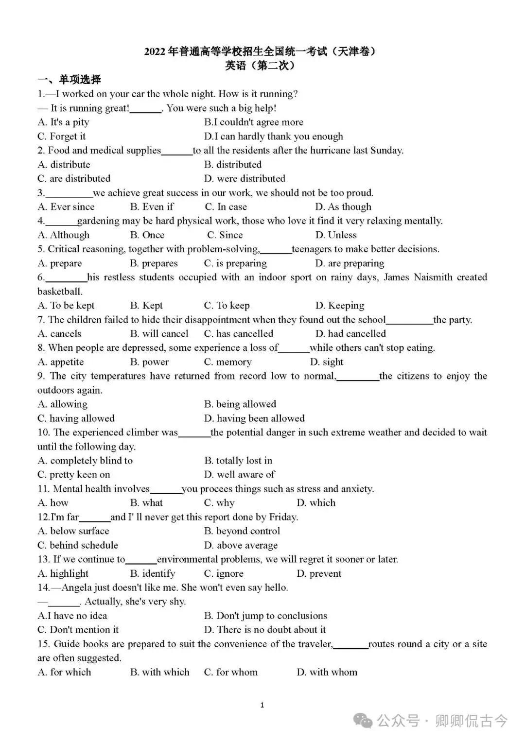 【可下载】2022年6月高考英语真题(天津卷)(附解析)