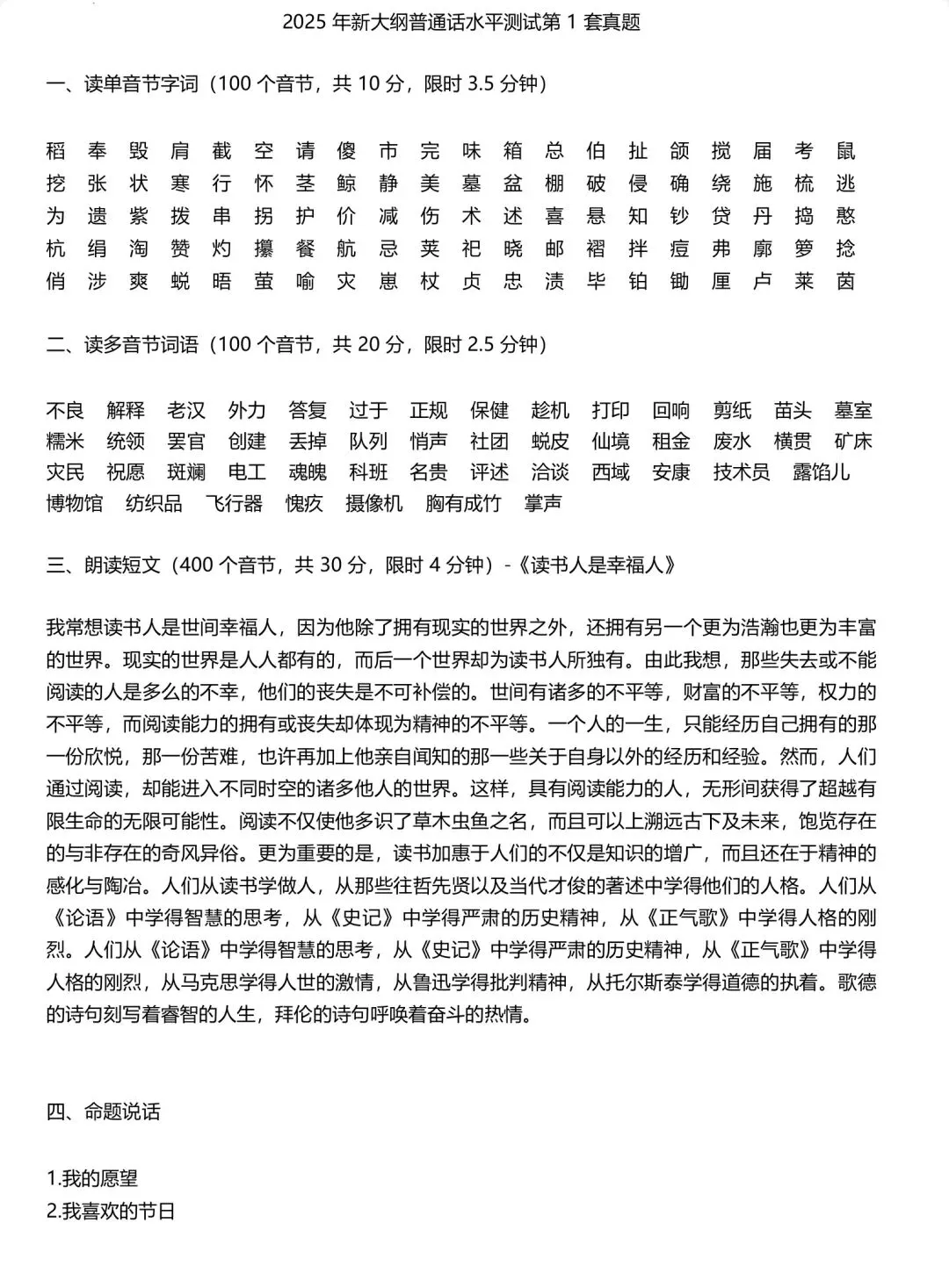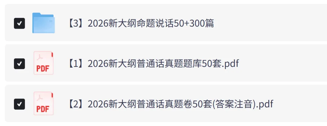 自2024年1月1日起,普通话水平测试大纲正式改革。根据官方发布的实施纲要,新大纲明确规定了朗读短文(共50篇)和命题说话(共50题)的具体内容。今天给大家带了2026年新大纲普通话考试真题题库50套,含带注音的解析版本,PDF电子版,可打印。