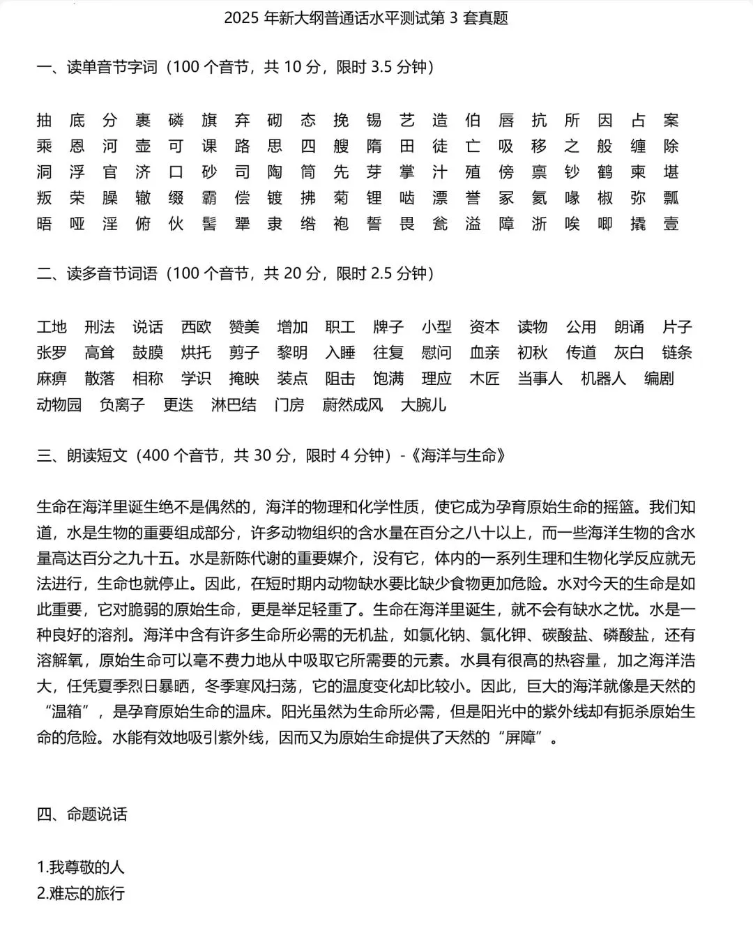 (4)命题说话:限时3分钟,共40分。考试需要从给定的两个话题中选择一个,并围绕话题连续说3分钟,需要自己发挥,大概600-700字,考前要背诵一些素材或者套话,考试时有话说就行,考察核心是流畅和发音标准。命题说话准备10–15个通用话题素材(教育、健康、科技、传统文化、环保等),确保3分钟不卡壳。