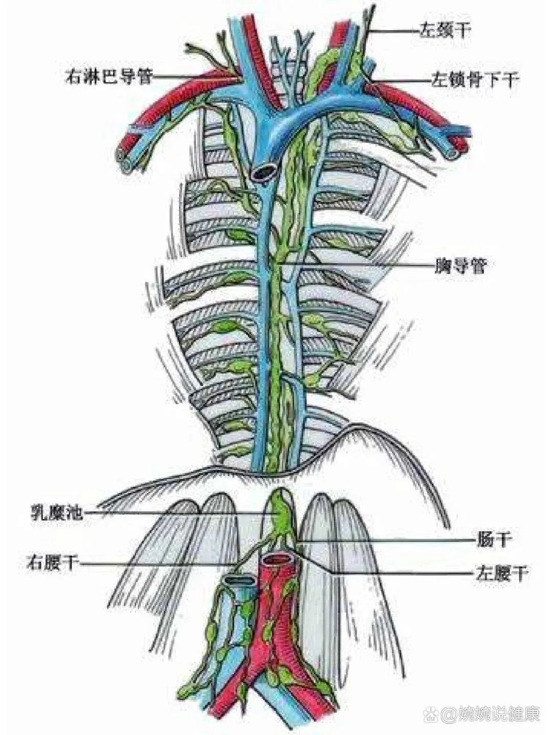胸导管穿经膈肌的主动脉裂孔进入胸腔,再上行至颈根部,最终汇入左静脉角。沿途接受左支气管纵隔干、左颈干和左锁骨下干的汇入,收集下半身及左上半身的淋巴。