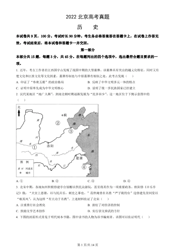 >2022北京高考真题历史真题(有答案)【可下载】