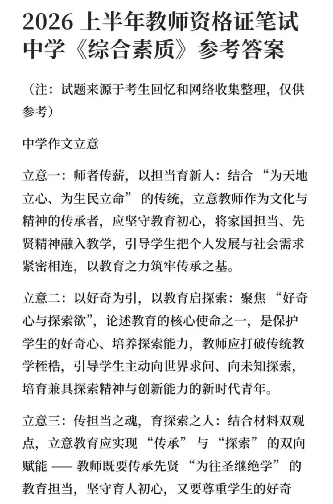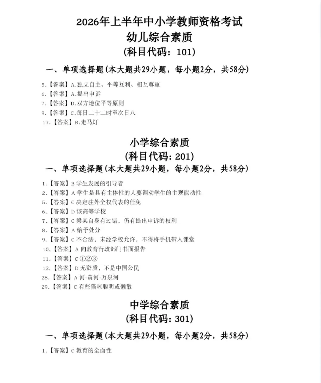 2026上半年教资考试《综合素质》真题答案(中学、小学、幼儿园),电子版合集部分内容展示: