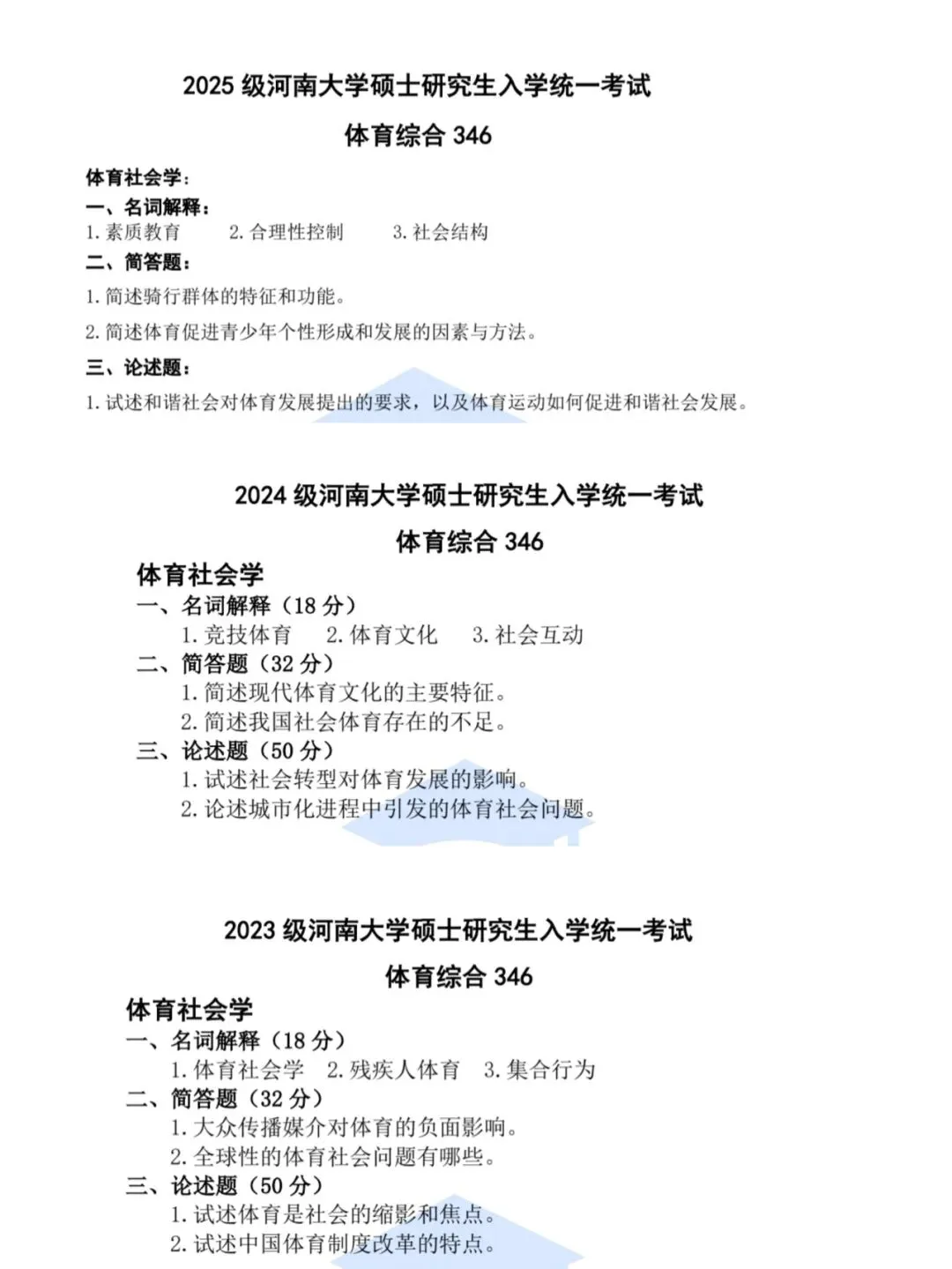 所以,我和几个已经上岸的研友(22级、23级、24级都有)花了一周时间,把2023年、2024年、2025年河南大学体育考研(专硕+学硕)的回忆版真题全部整理成了高清PDF!