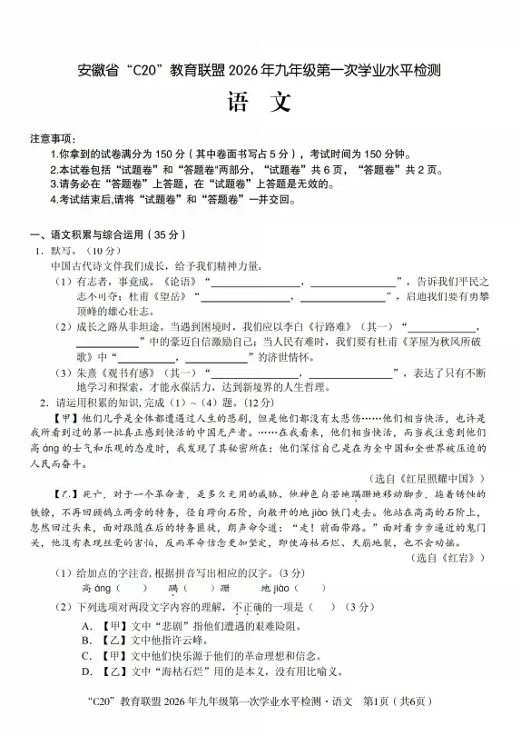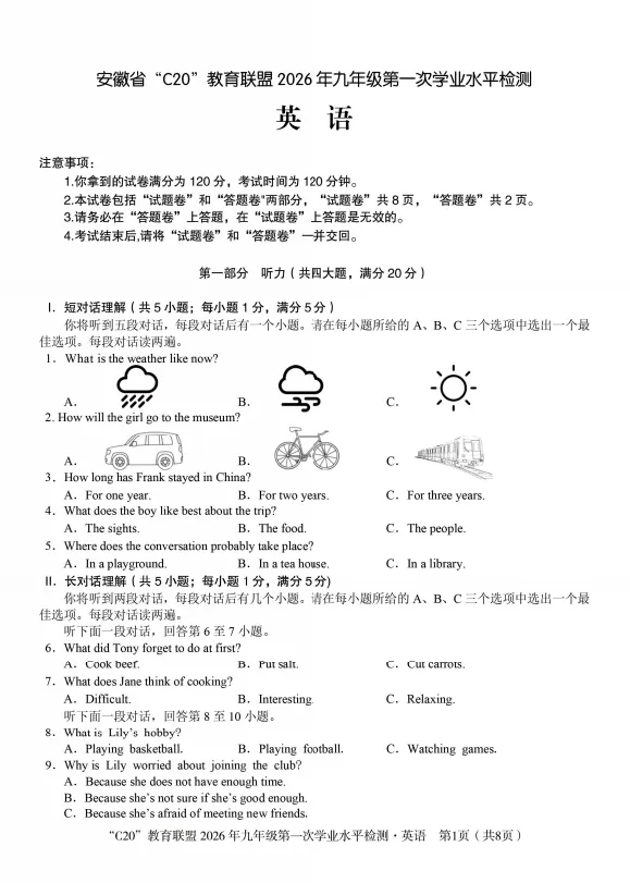 >2026安徽省C20教育联盟九年级试卷及答案