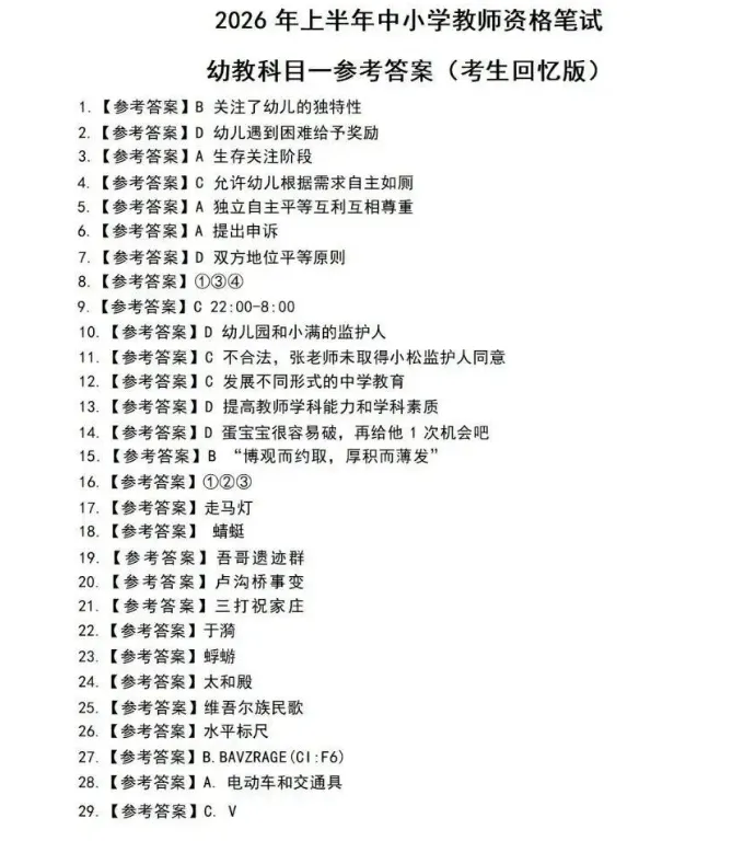 2026上半年幼儿园教资笔试科目一《综合素质》、科目二《保教知识与能力》真题试卷+参考答案