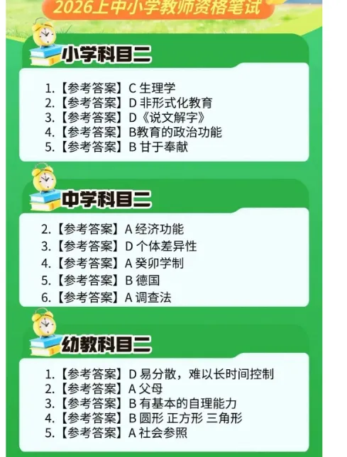 目前,2026上半年教资笔试中学教资笔试科目三《学科知识与教学能力》(初中+高中)已经结束,真题答案上传更新中,可以来准备对答案了!