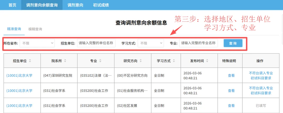 阅读院校调剂办法,查询计划余额。