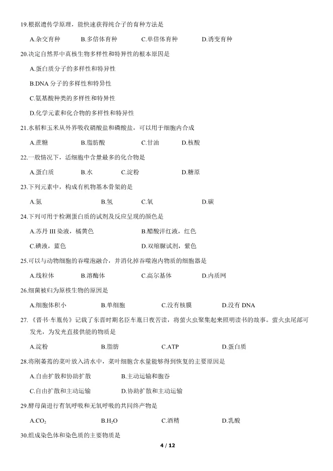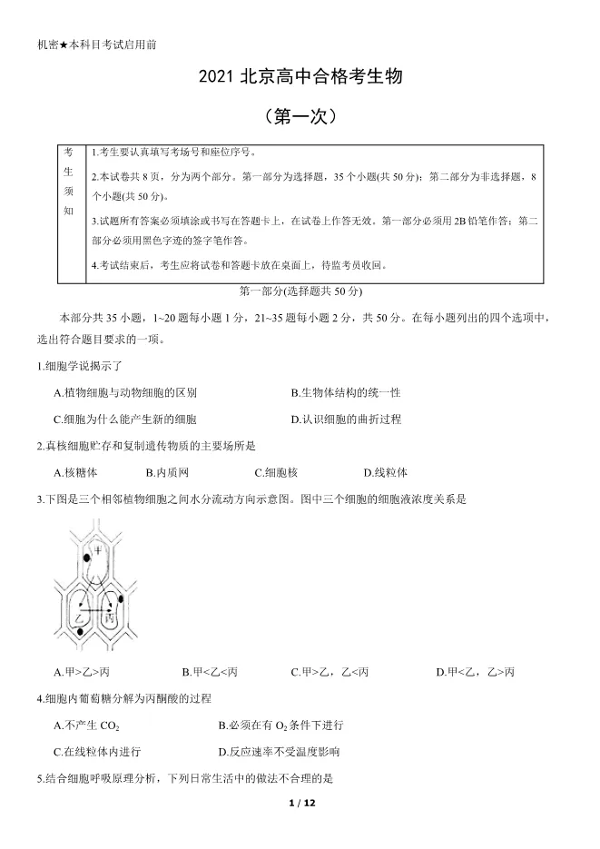 >2021北京高中合格考生物试卷生物会考真题(第一次有答案)【可下载】