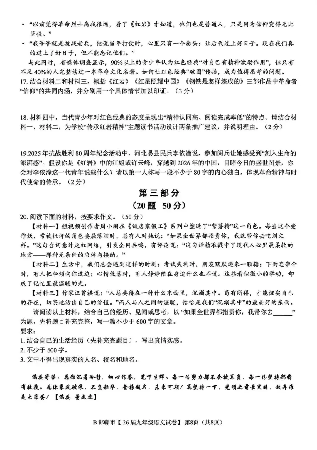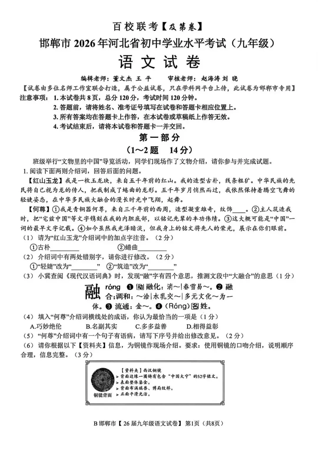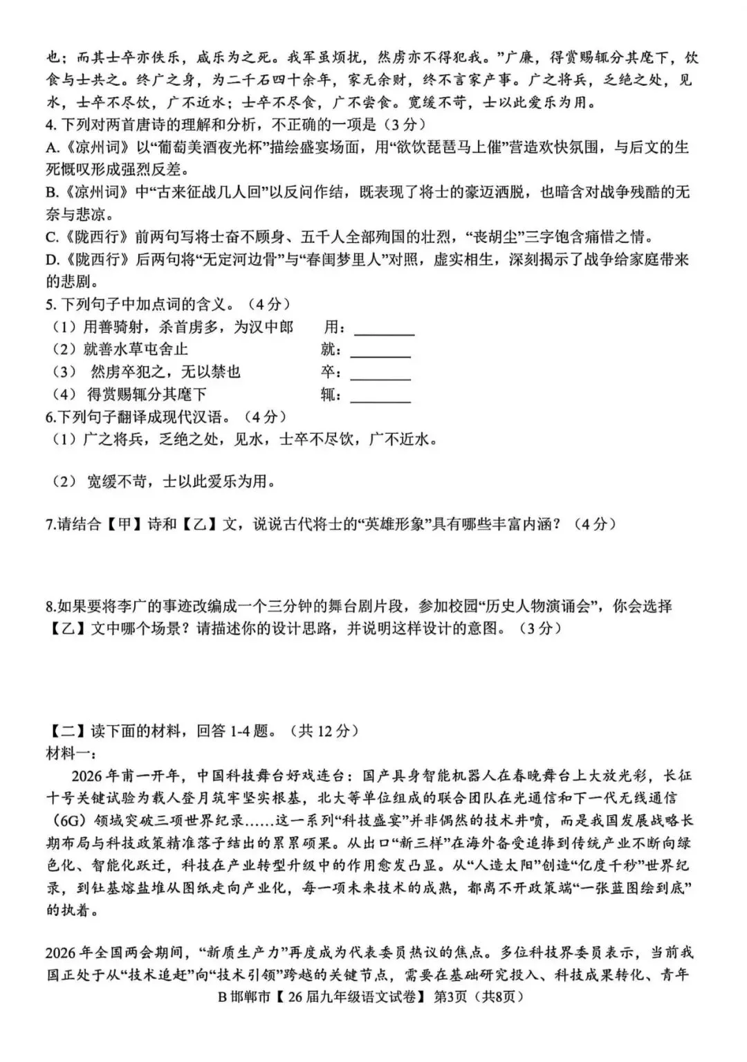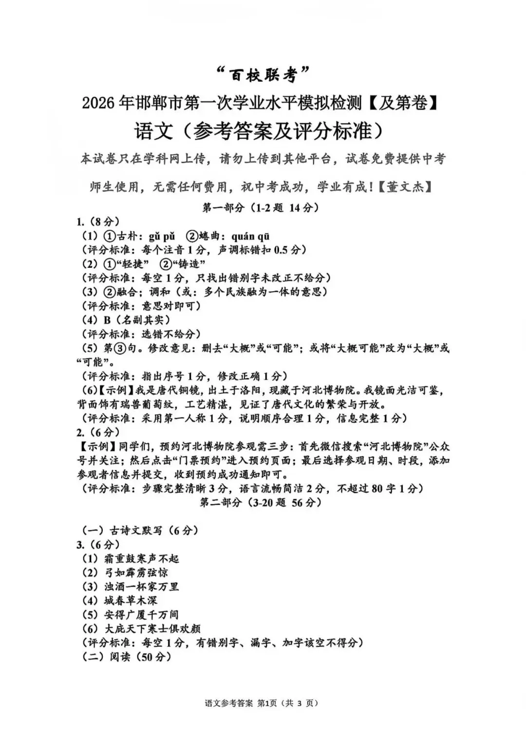 >2026年邯郸市九年级百校联考语文试卷(含答案)