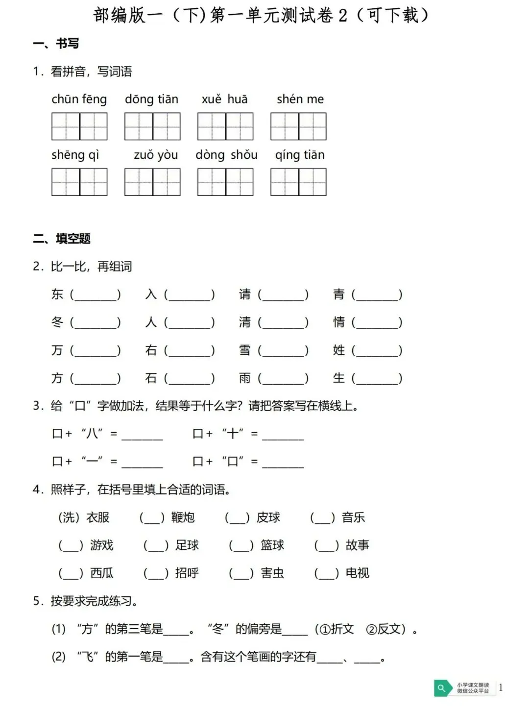 部编语文一年级上册第2单元测试卷(可下载)