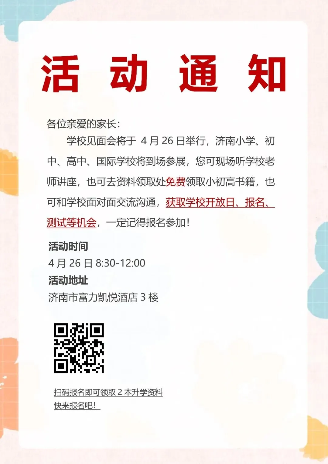 名校云集!济南小初高学校到场,近30所学校到现场和您面对面交流,现场咨询招生政策,获取最新招生信息,⬇️扫码报名,和30所学校面对面沟通交流