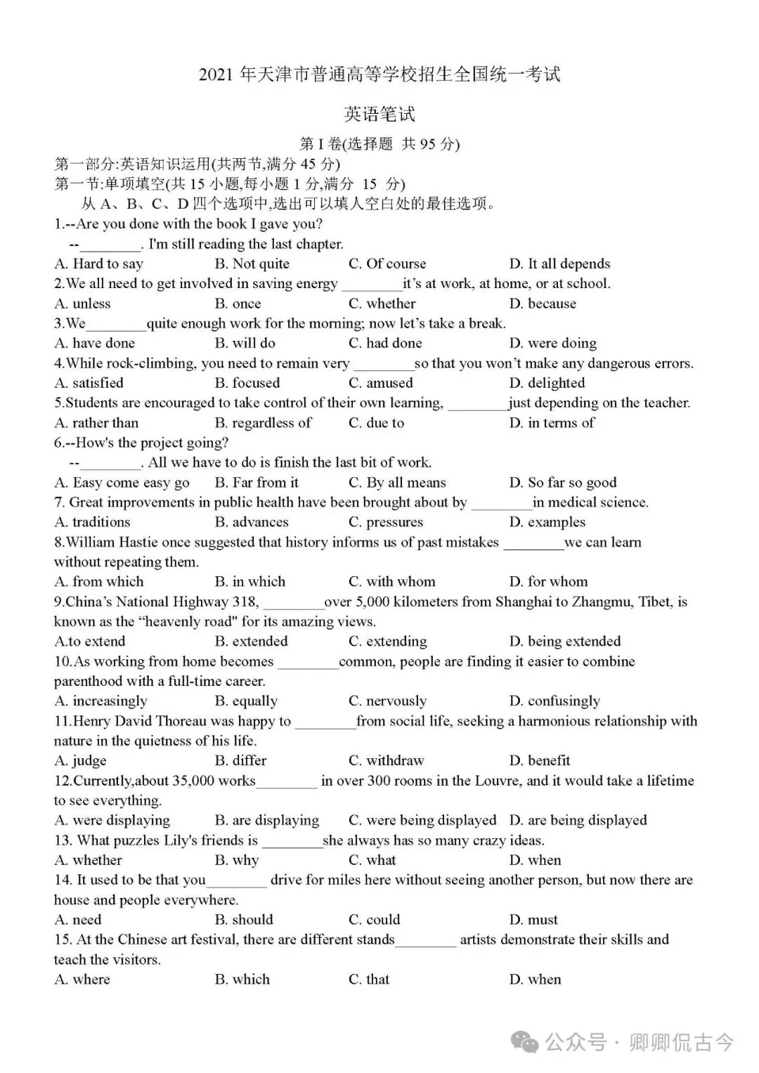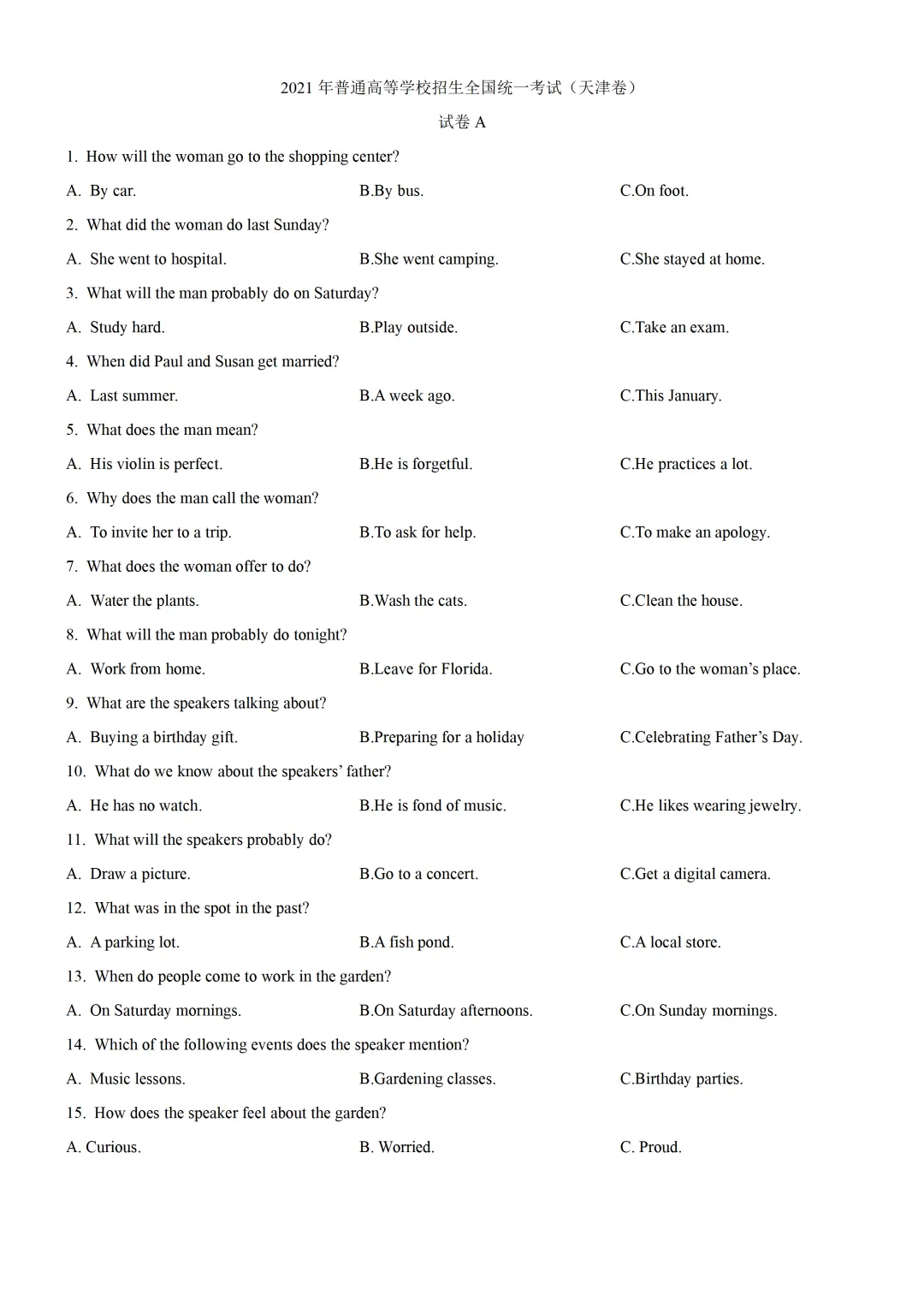 【可下载】2021年3月高考英语真题(天津卷)(附解析+音频)