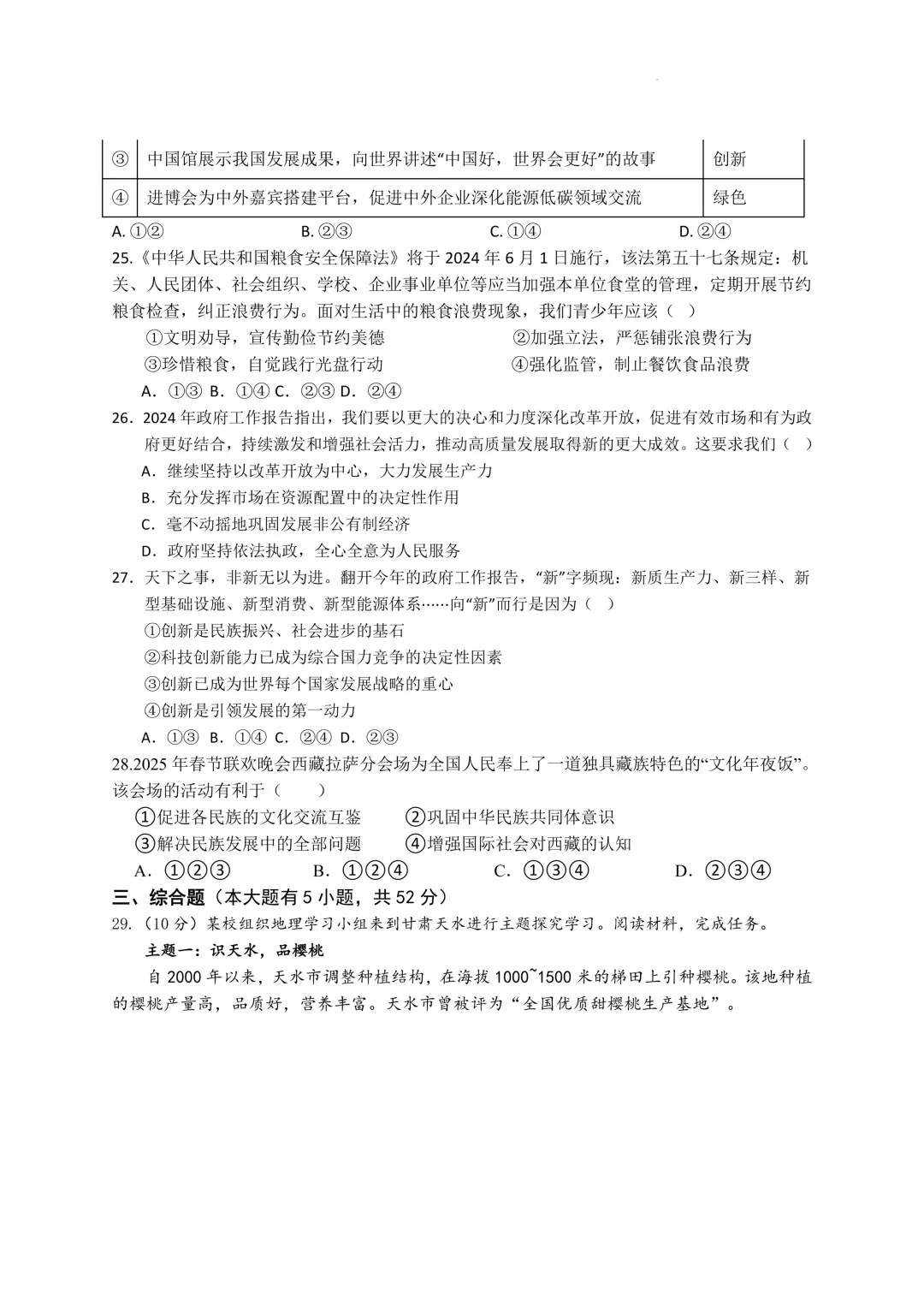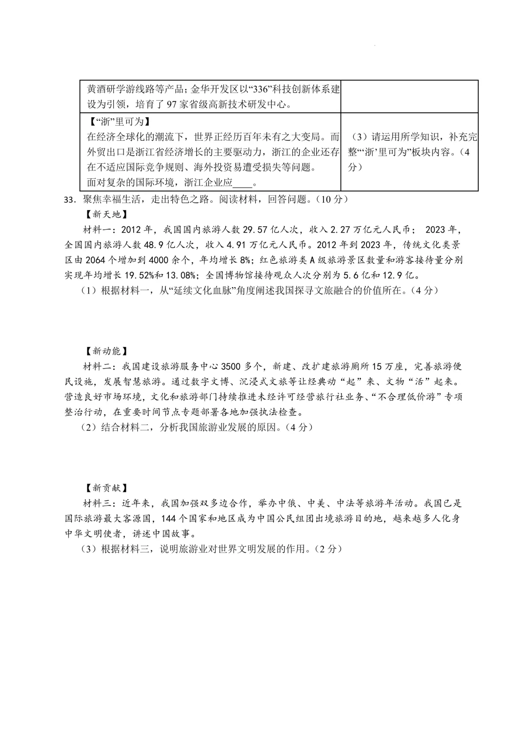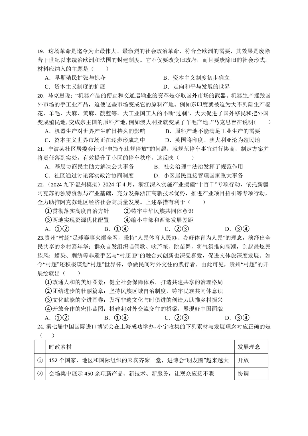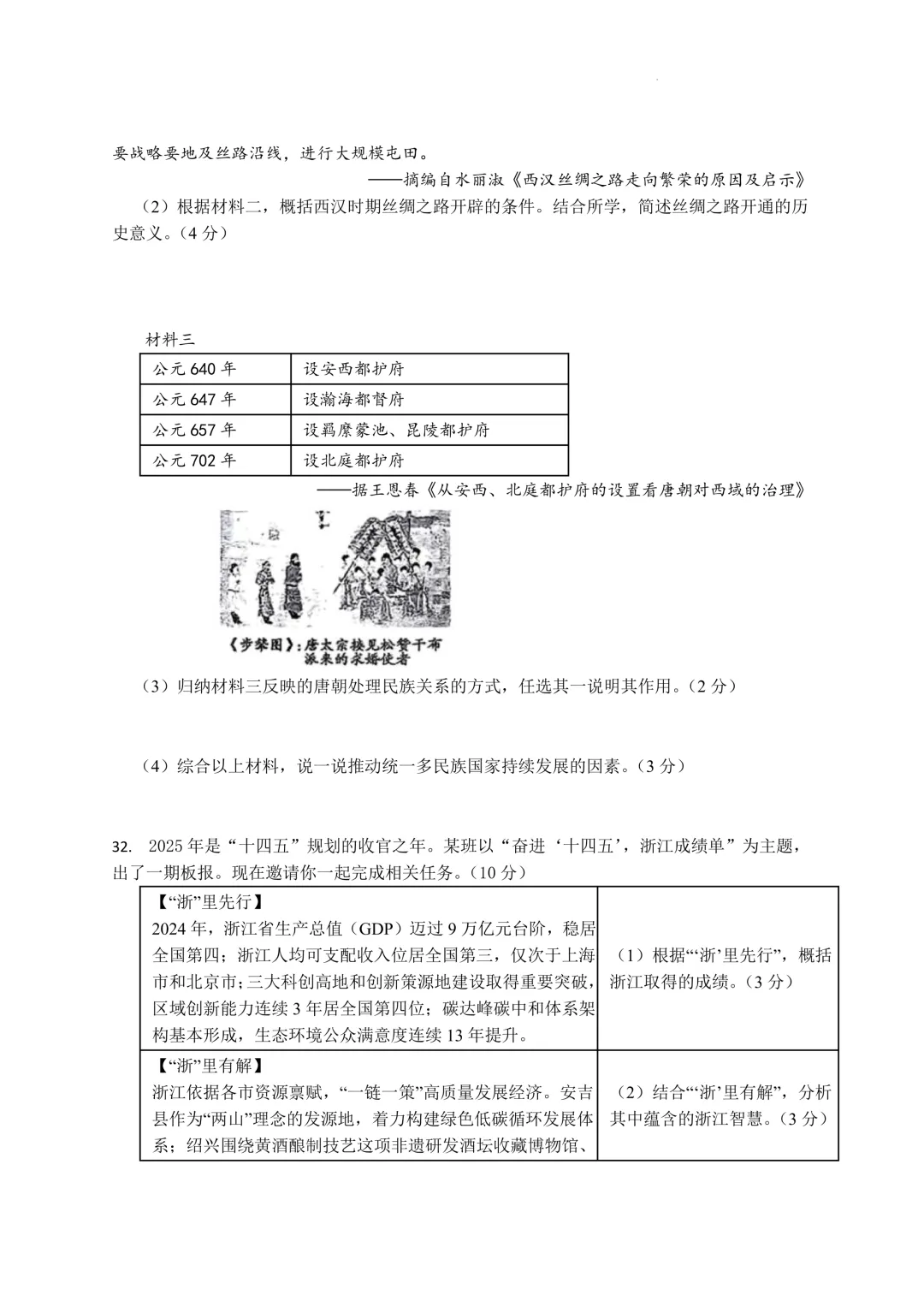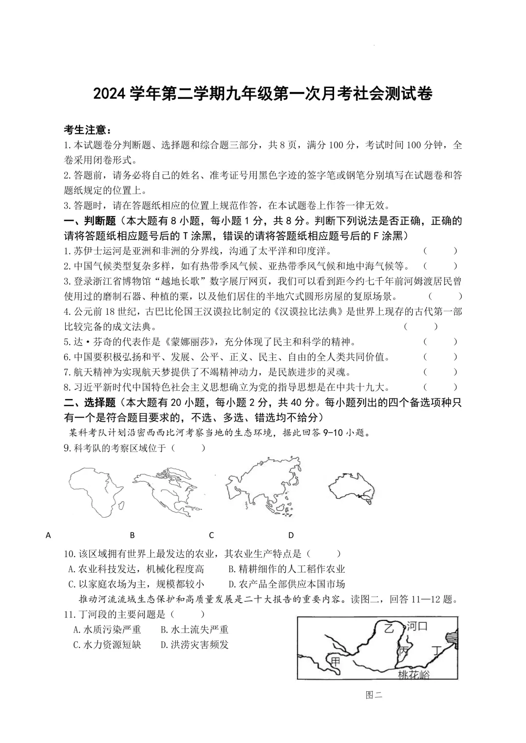 鄞州区十二校联考初三开学考社会卷及答案(25.3)