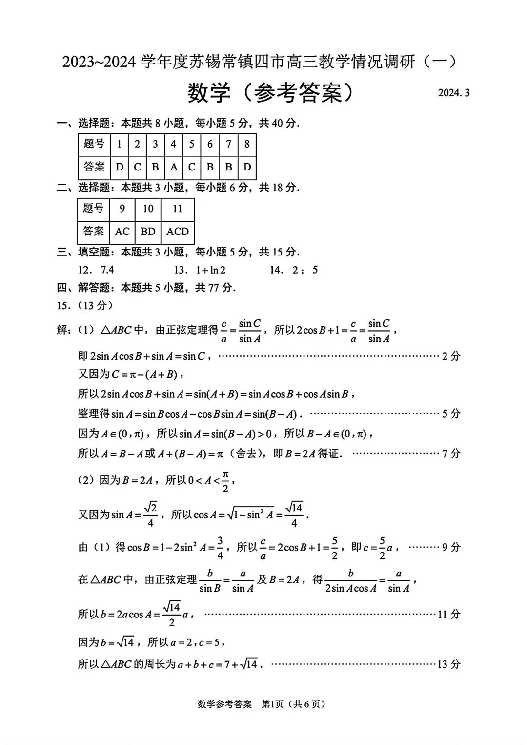 >2024年苏锡常镇高三一模数学试卷+答案(2024.03)