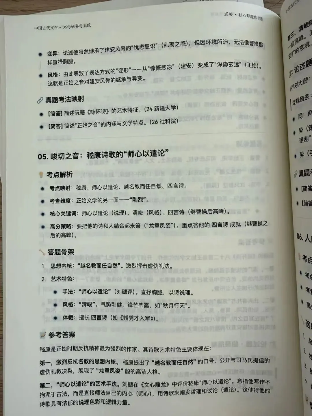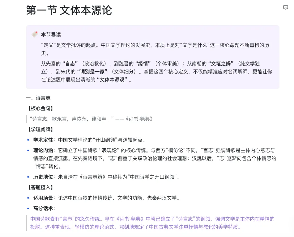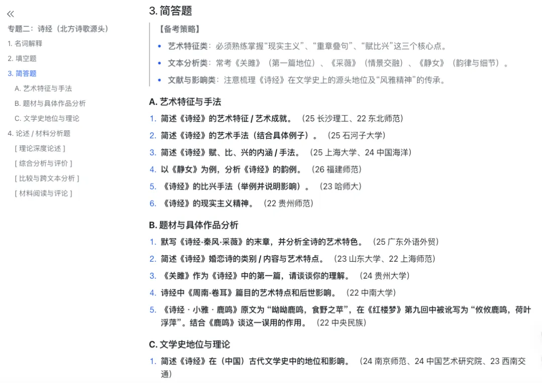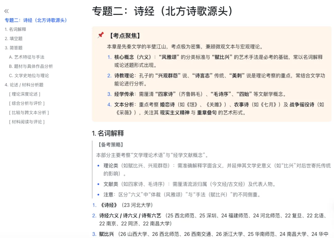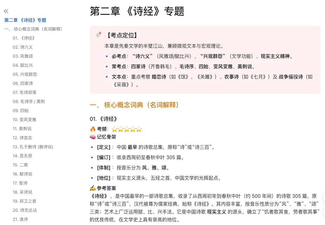 这部分我也一直在同步做。我把近百所高校历年真题分析汇总之后,进一步抽取出了常考母题,并输出参考答案,整理成了【中国古代文学·os考研备考系统】中的第八部分 《通关·核心母题库》。本质上,这就是把零散真题转化成“可直接训练的标准答案”。