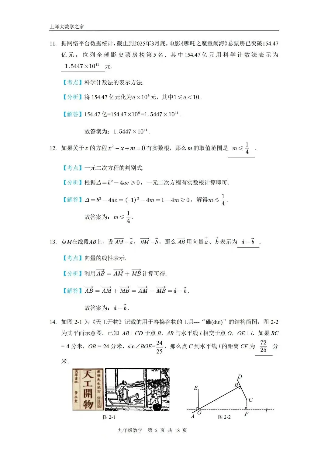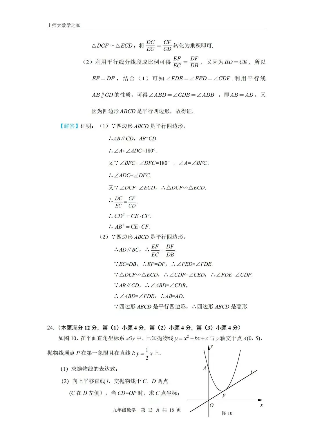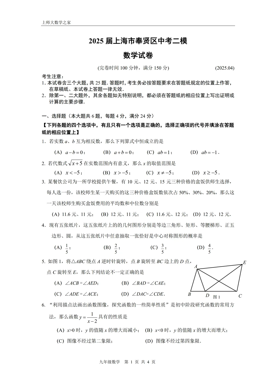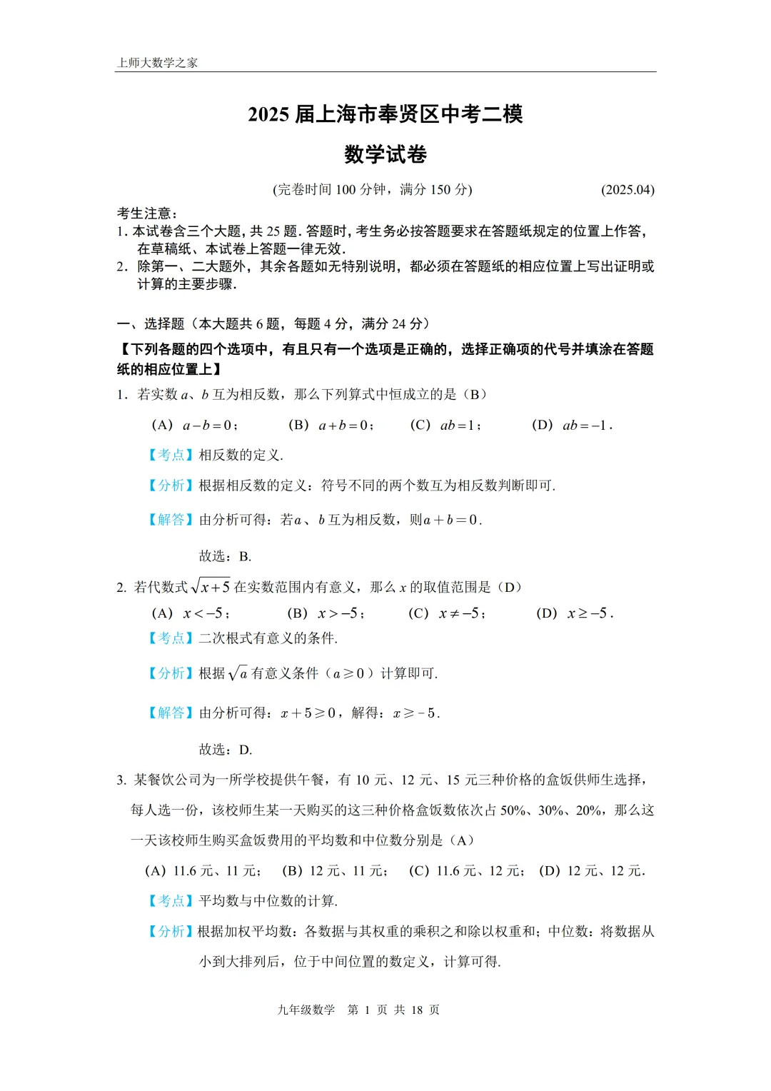 今日解析2025届上海市奉贤区中考数学二模试卷,试卷源自互联网,部分解析思路有所借鉴。