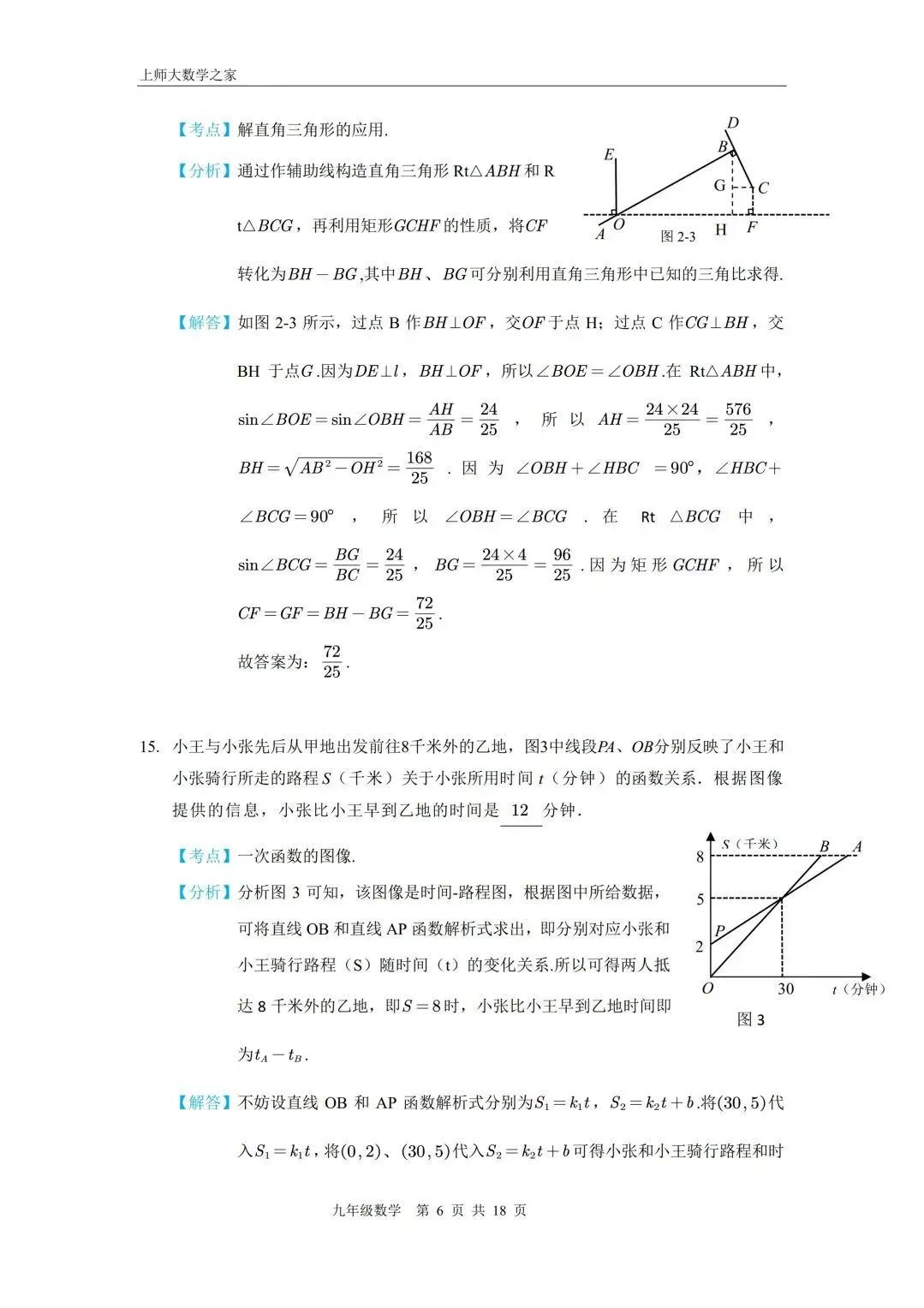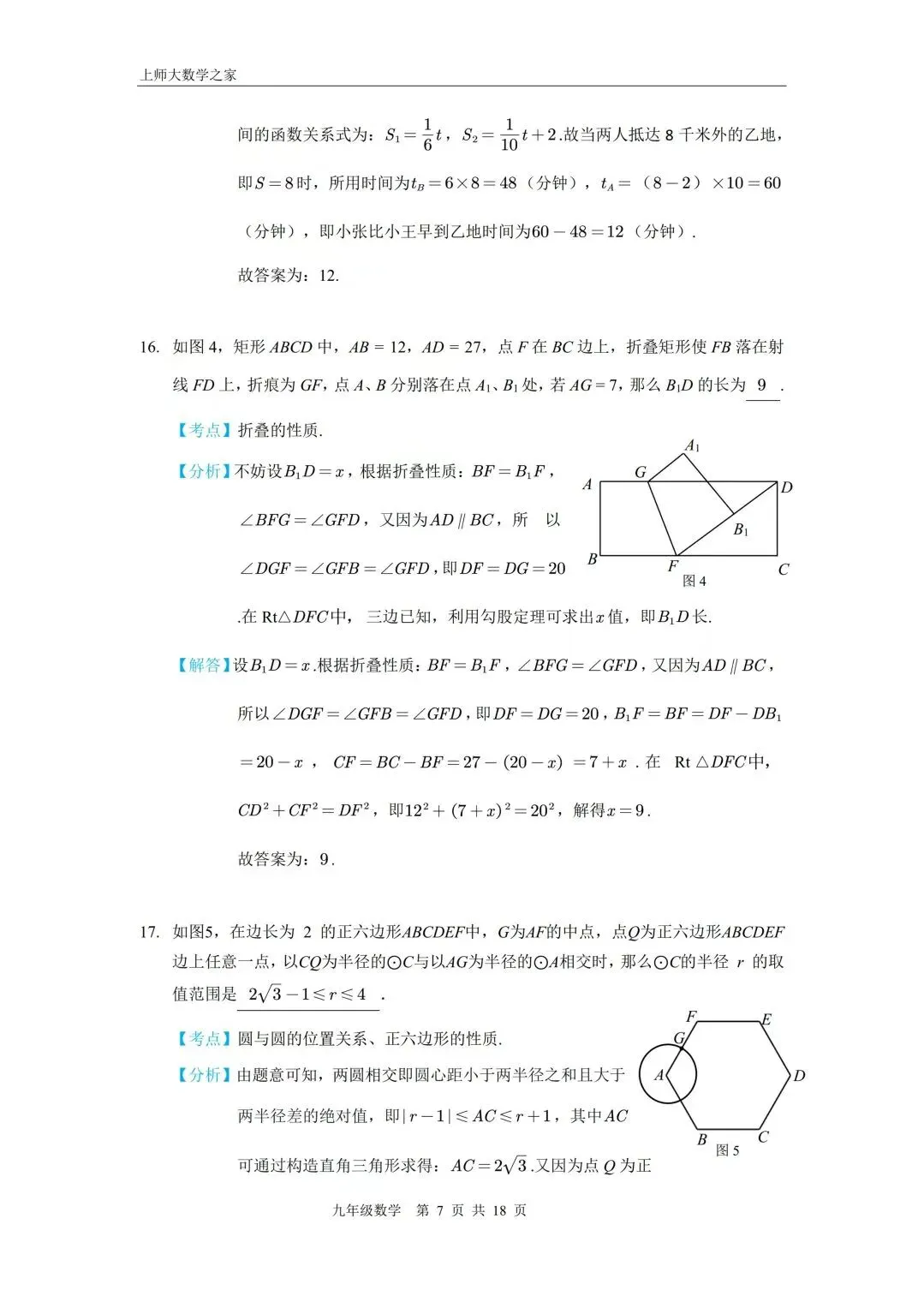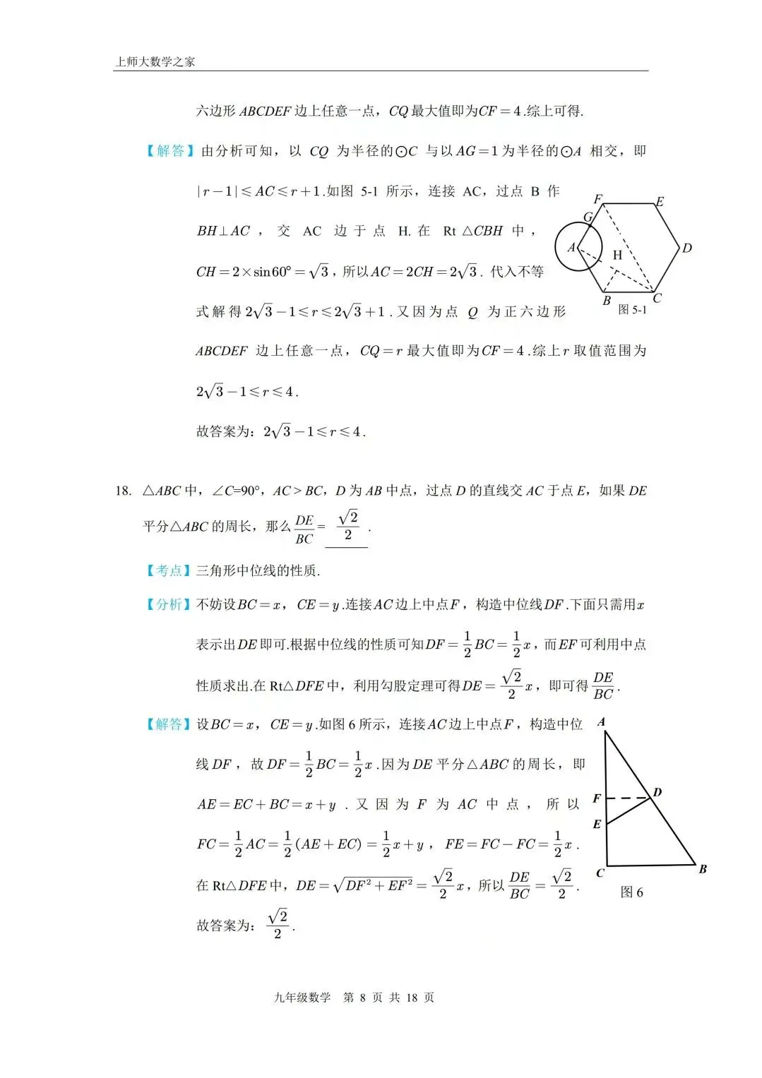 第6题巧用函数图像平移规律;第16题翻折问题涉及“角平分线+平行线”,证等腰三角形;第17题考查圆与圆的位置关系以及与正六边形的性质,锻炼综合运用知识能力;第18题突破在于构造中位线,寻找直角三角形各边关系。