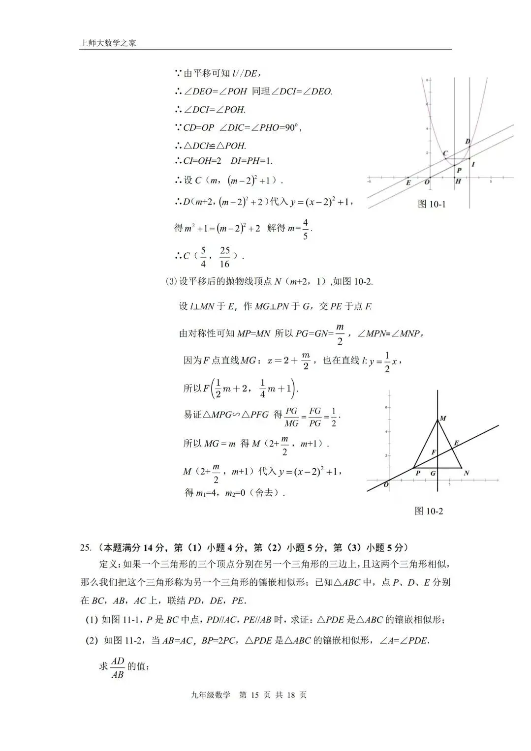 第19~23题为基础题。第24题需要熟练掌握函数图像平移规律,通过作辅助线构造全等和相似三角形求距离;第25题引入新定义,考查一线三等角模型和相似三角的综合运用,前2问难度不大,第3问注意相似三角形存在的多解性,涉及到四点共圆知识。