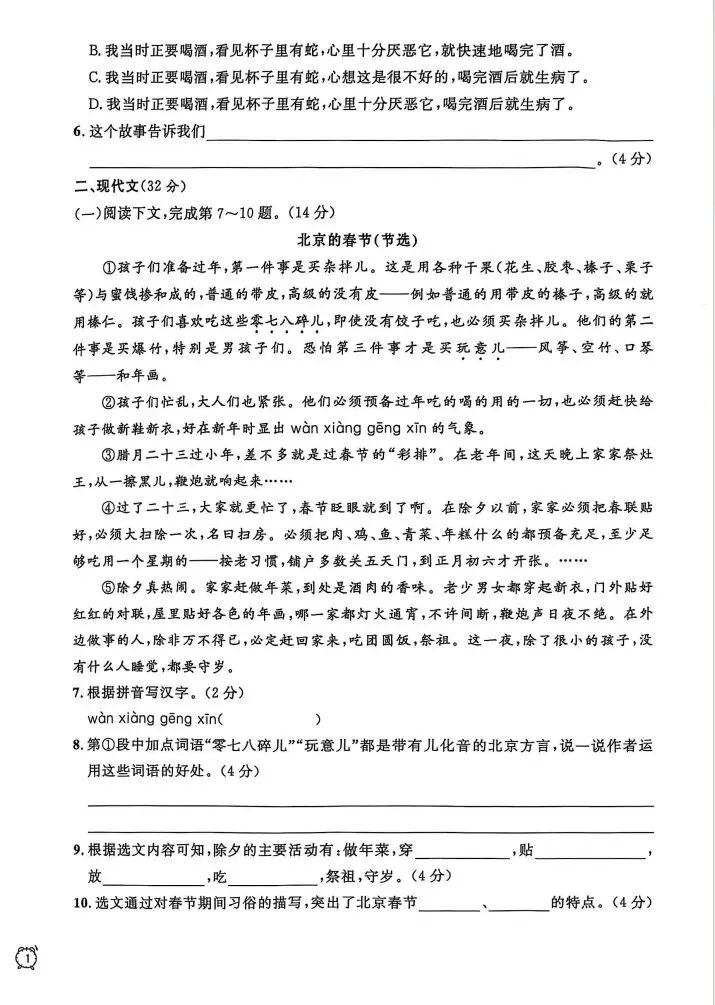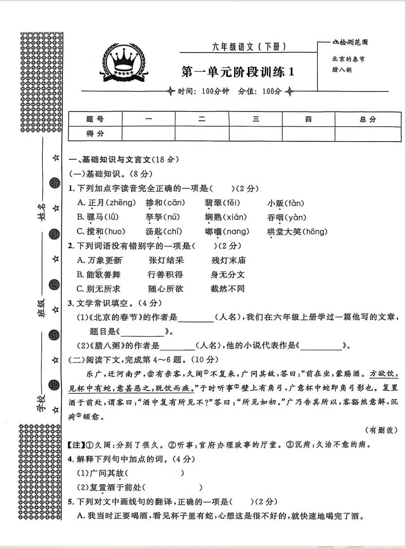【A637语文】六年级(下)语文金试卷A4版(新)