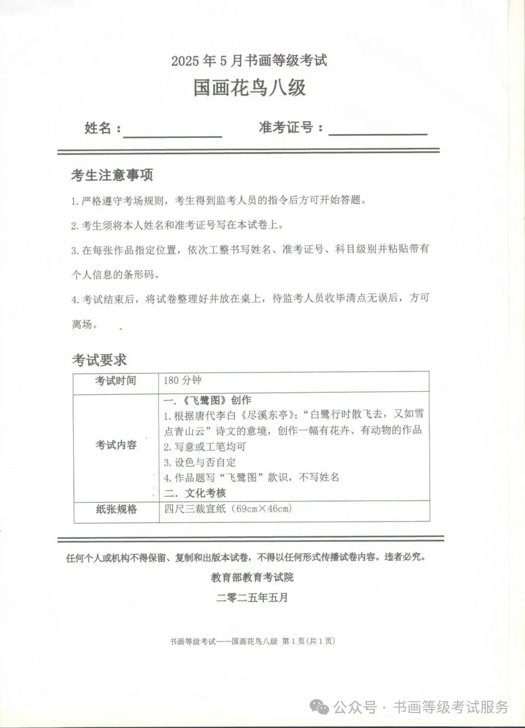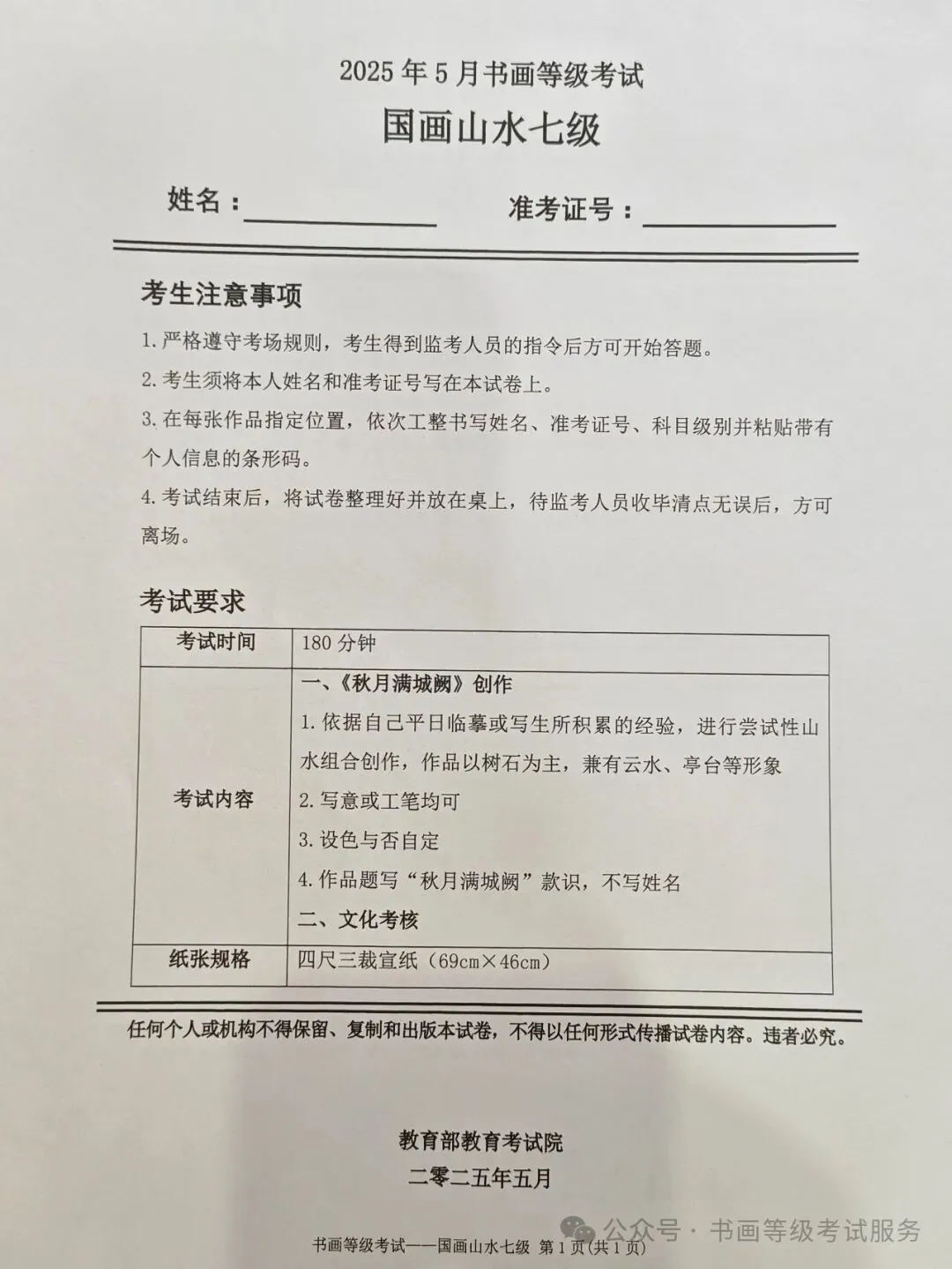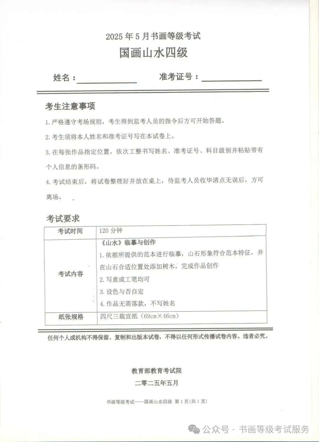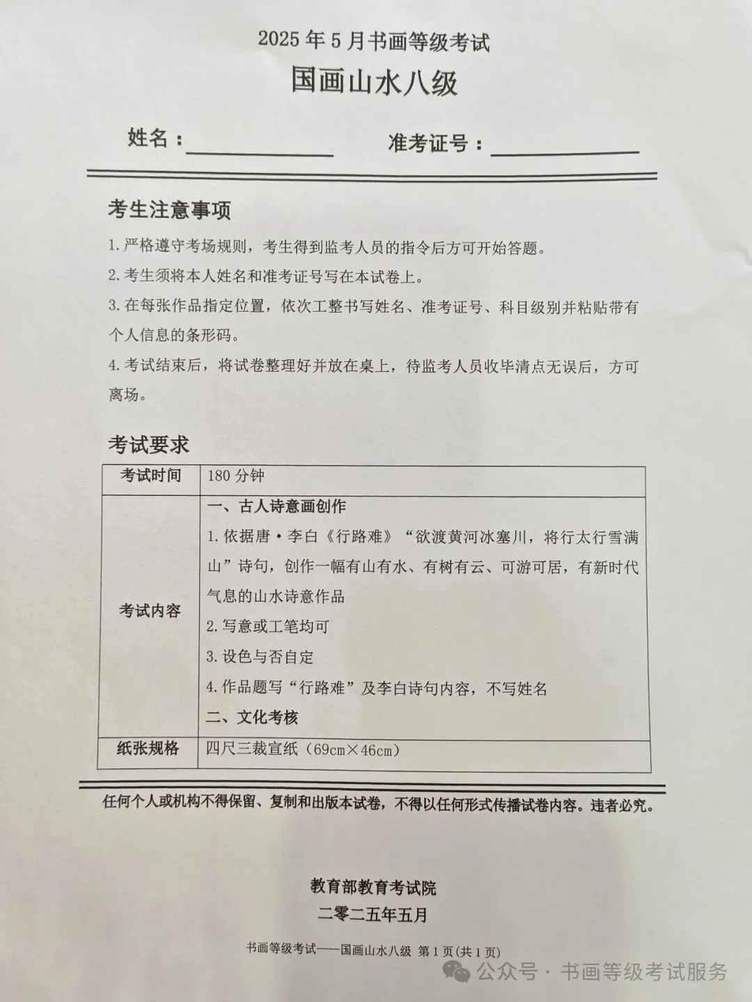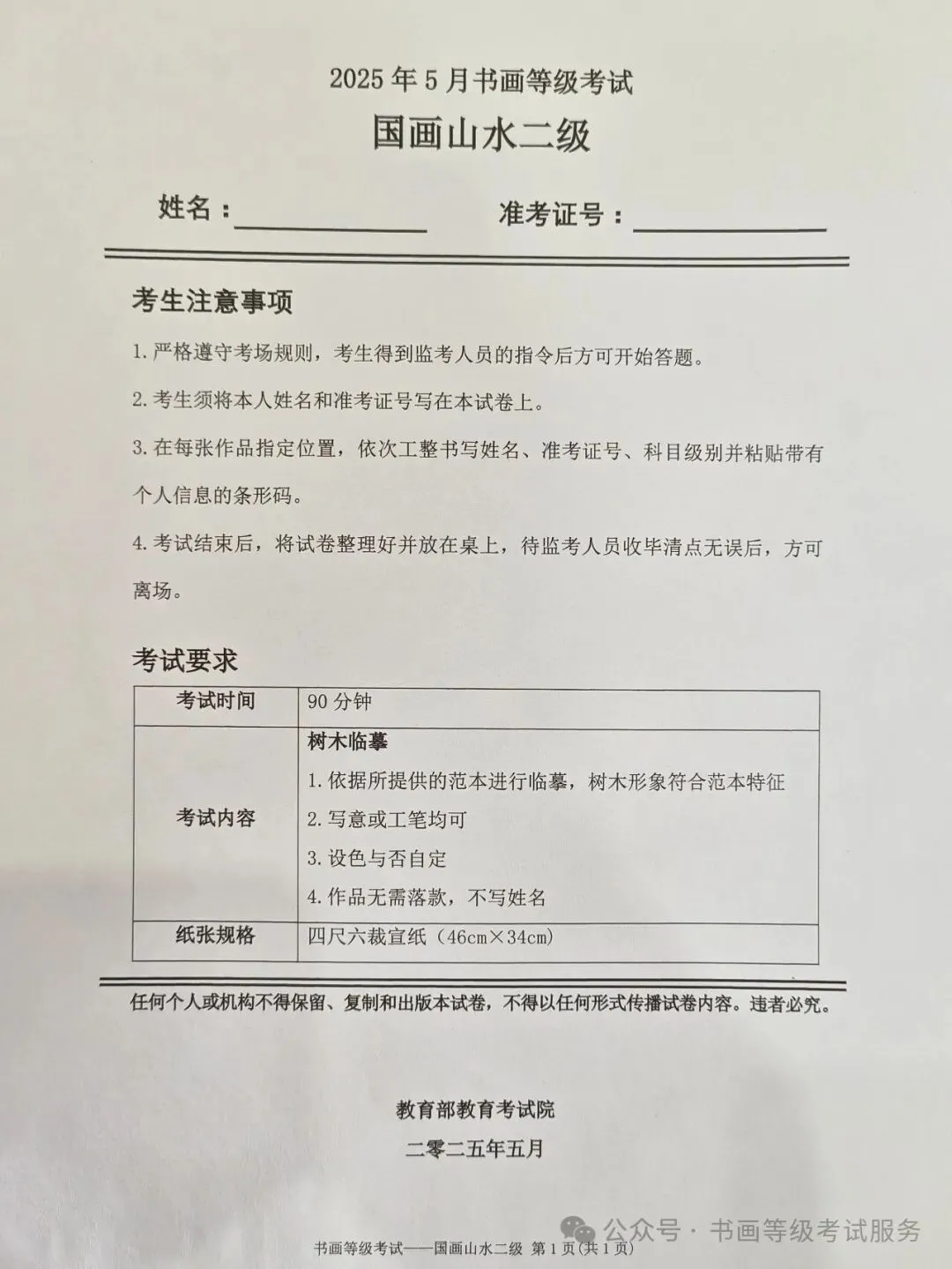 临沂市考试中心办公室为了协助考试点、中小学校、高职院校及书画培训机构,有针对性地培训及辅导报考参加教育部书画等级考试的考生,提高考级辅导老师专业水平和工作(辅导)效率,整理出教育部考试中心书画等级考试2025年5月考试真题,辅助资料以供考前模拟练习使用,进而协助老师辅导及考生练习使用,确保教育部教育考试院书画等级考试临沂市考生整体通过率再次提高!