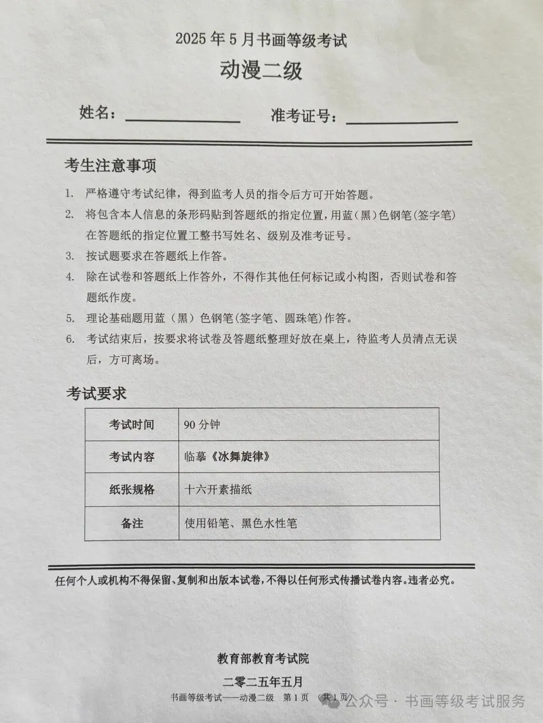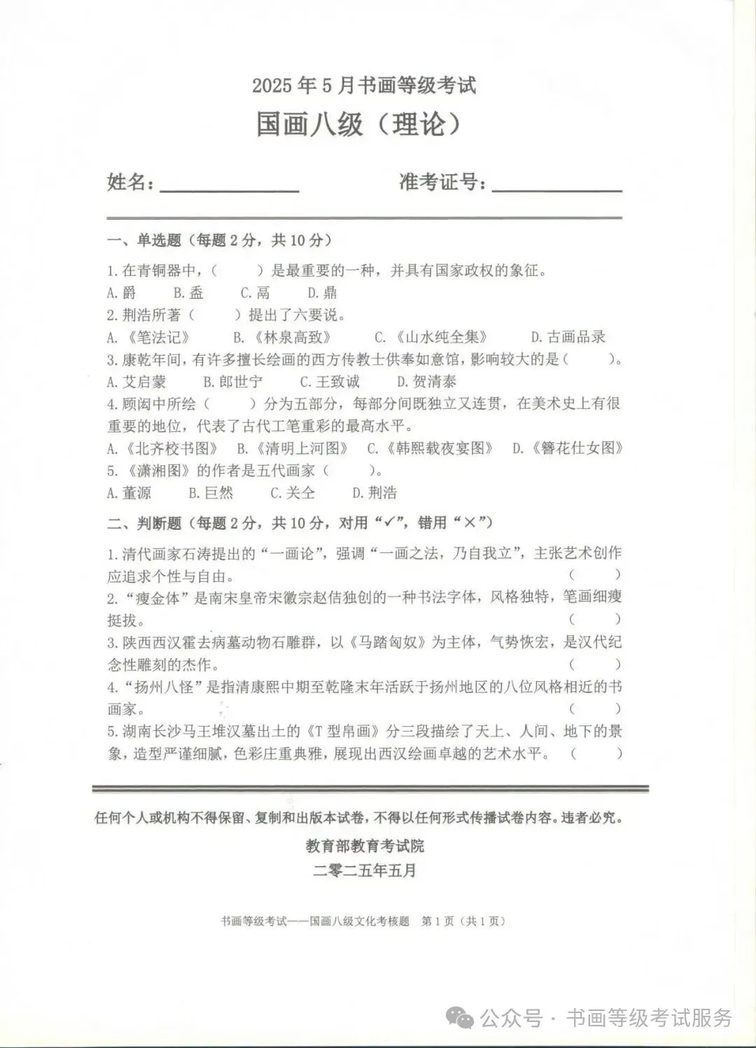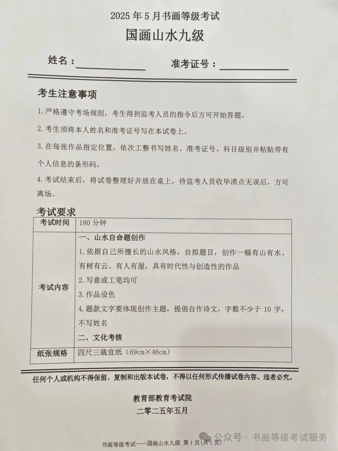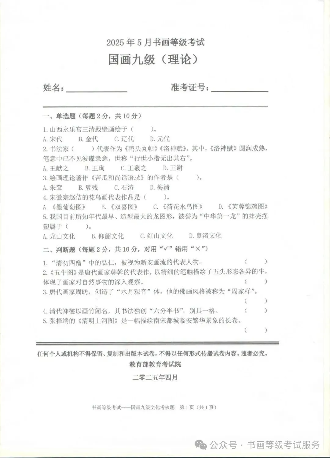 临沂考试中心办公室为了协助考试点、中小学校、高职院校及书画培训机构,有针对性地培训及辅导报考参加教育部书画等级考试的考生,提高考级辅导老师专业水平和工作(辅导)效率,整理出教育部考试中心书画等级考试2025年5月考试真题,辅助资料以供考前模拟练习使用,进而协助老师辅导及考生练习使用,确保教育部教育考试院书画等级考试临沂市考生整体通过率再次提高!