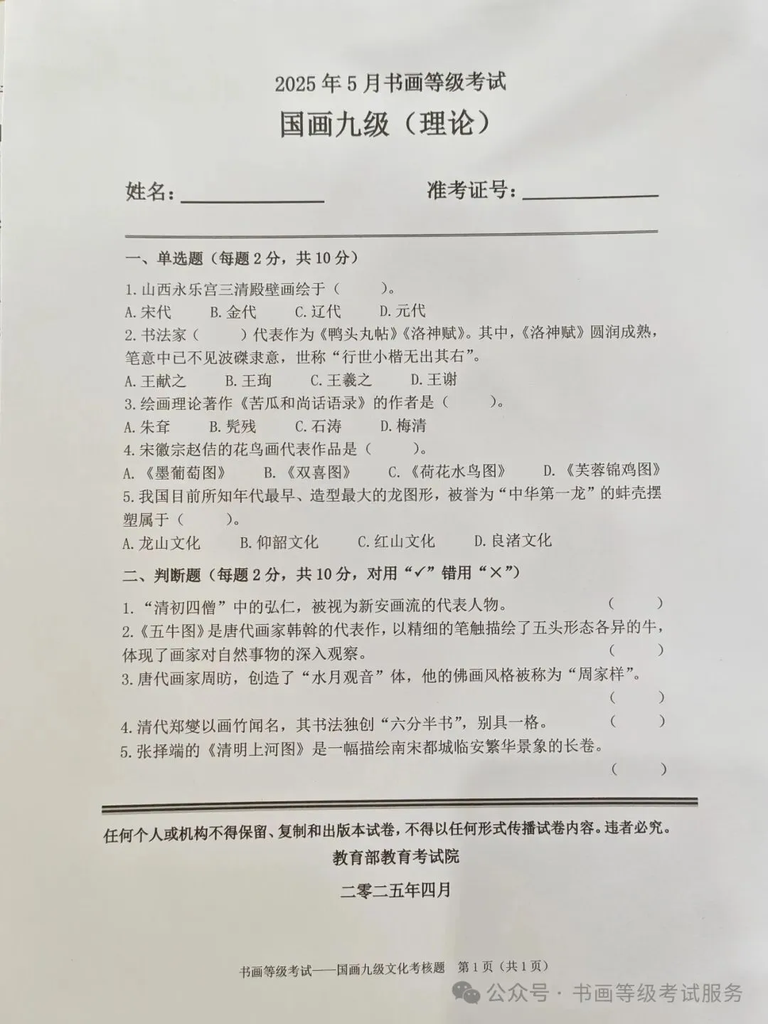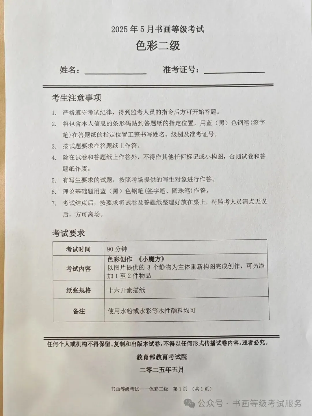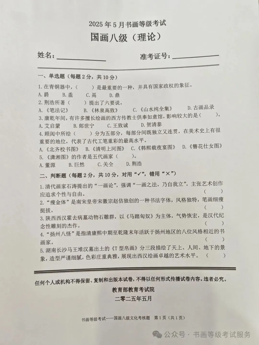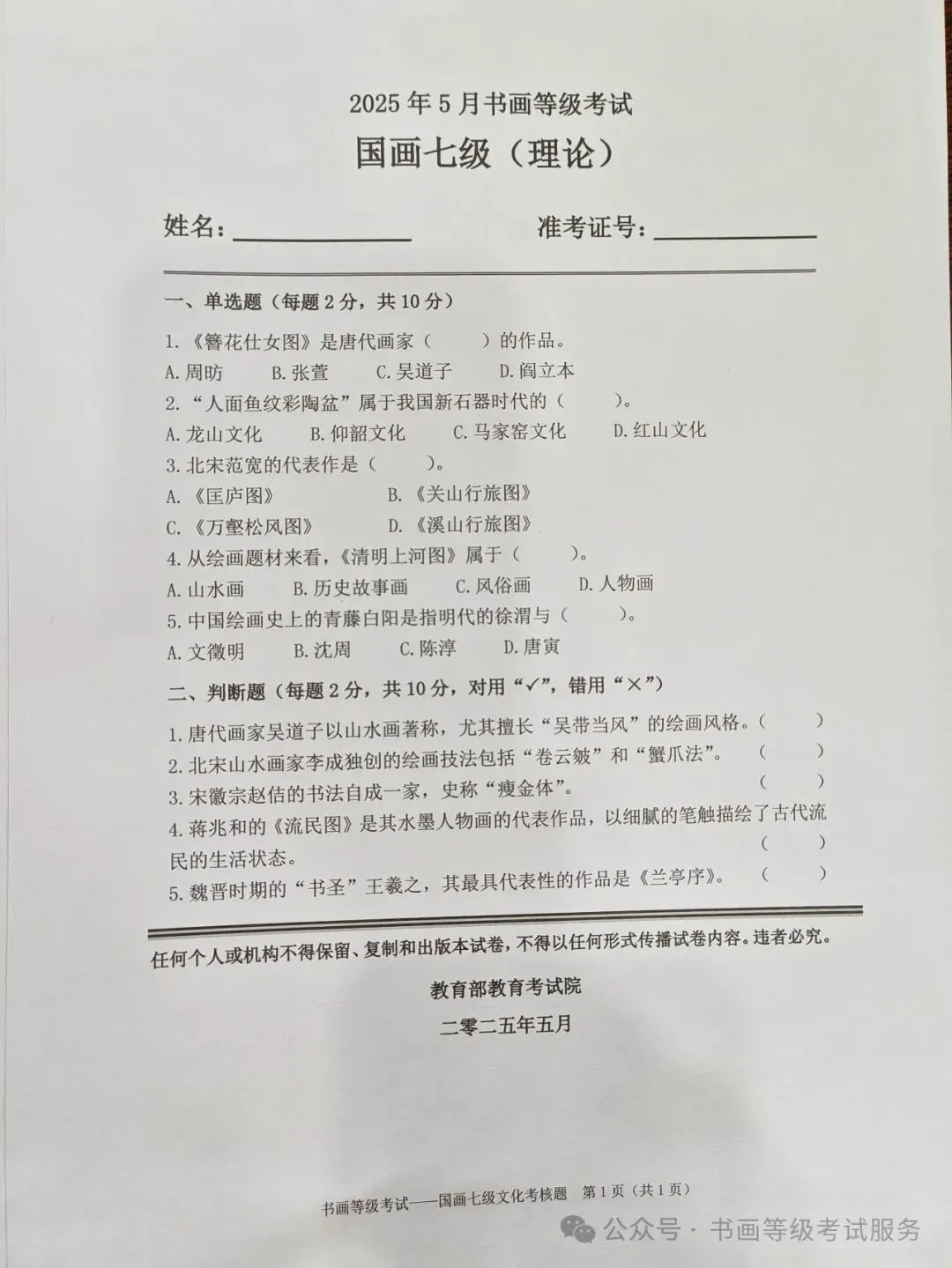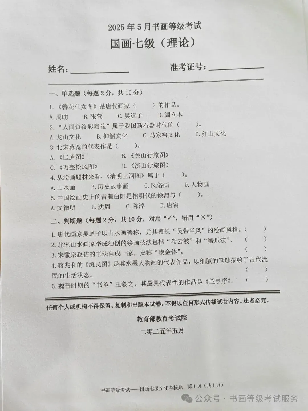 临沂考试中心办公室为了协助考试点、中小学校、高职院校及书画培训机构,有针对性地培训及辅导报考参加教育部书画等级考试的考生,提高考级辅导老师专业水平和工作(辅导)效率,整理出教育部考试中心书画等级考试2025年5月考试真题,辅助资料以供考前模拟练习使用,进而协助老师辅导及考生练习使用,确保教育部教育考试院书画等级考试临沂市考生整体通过率再次提高!
