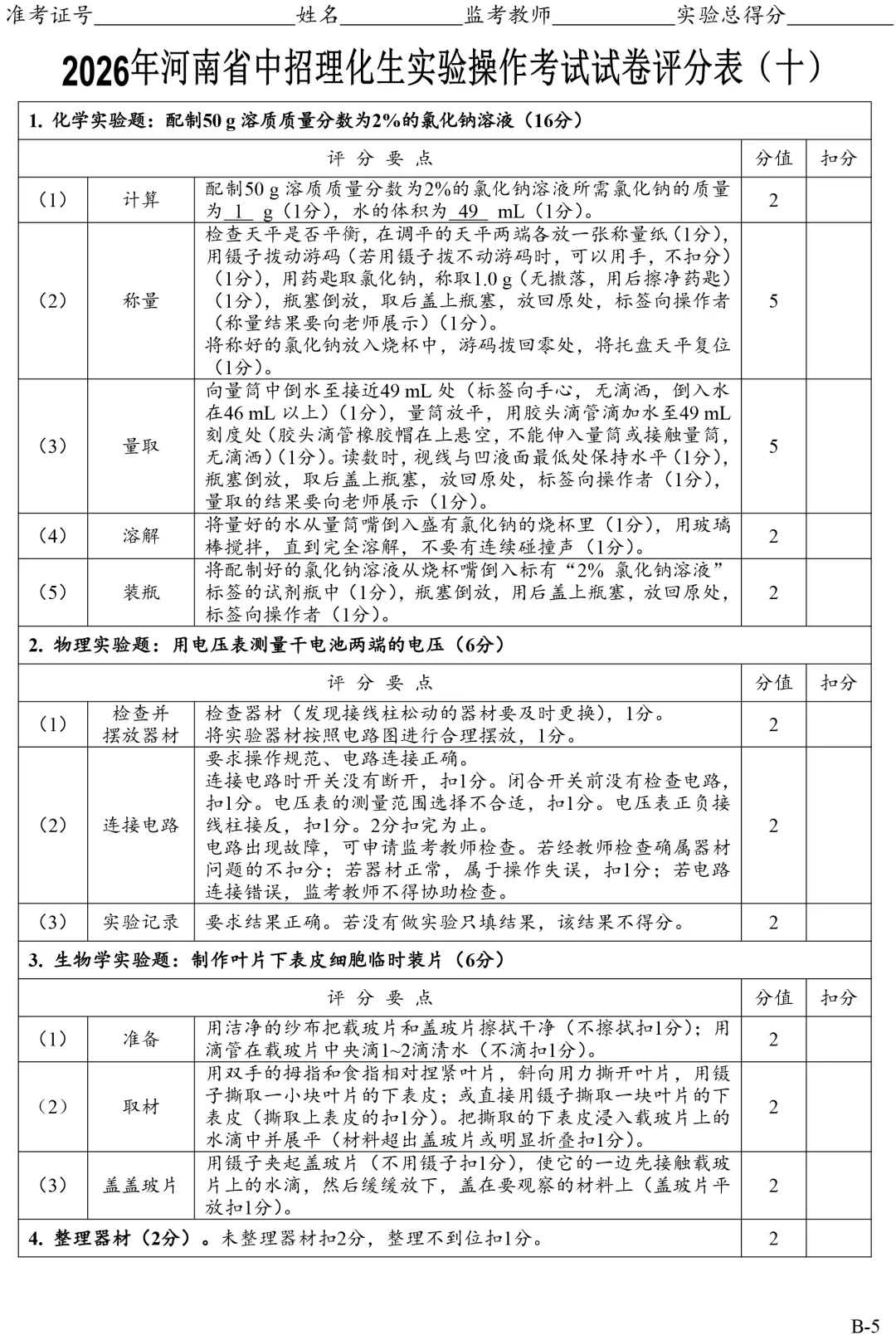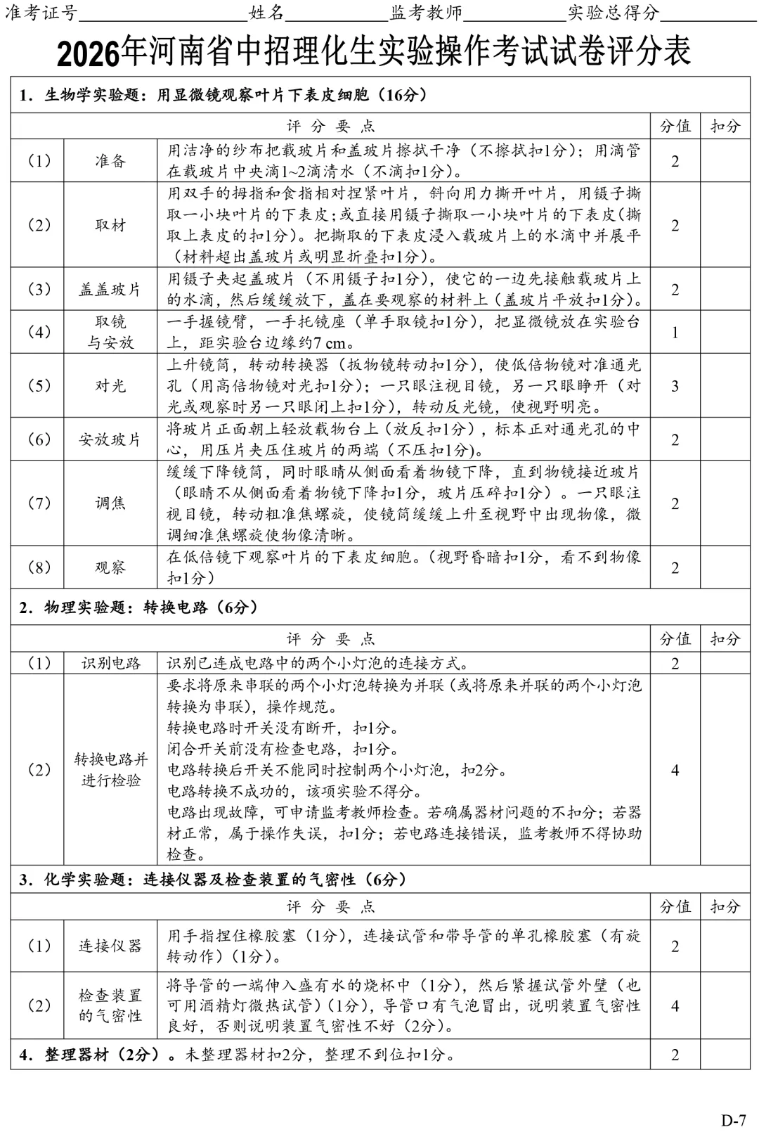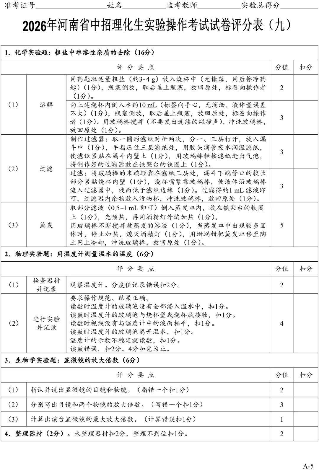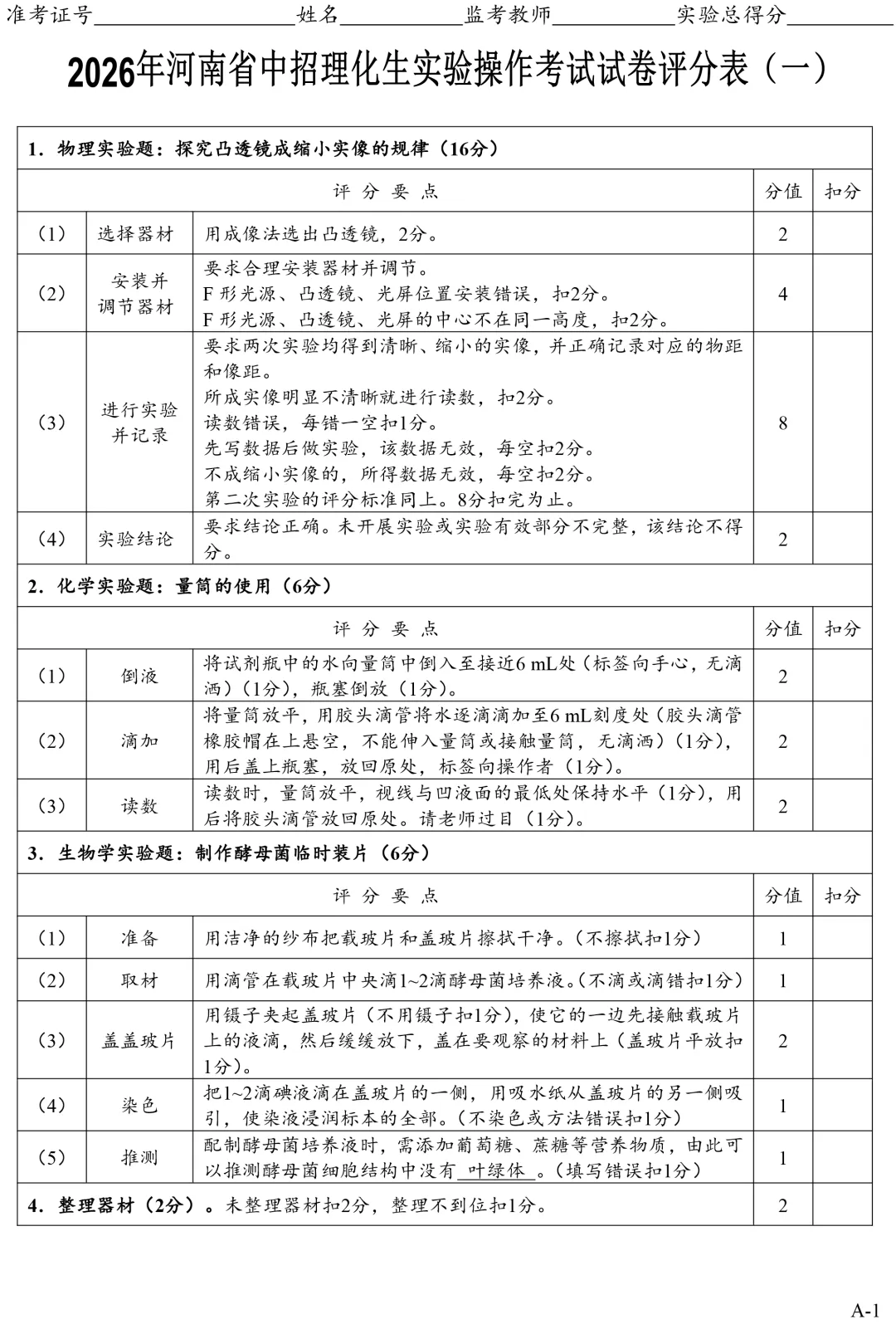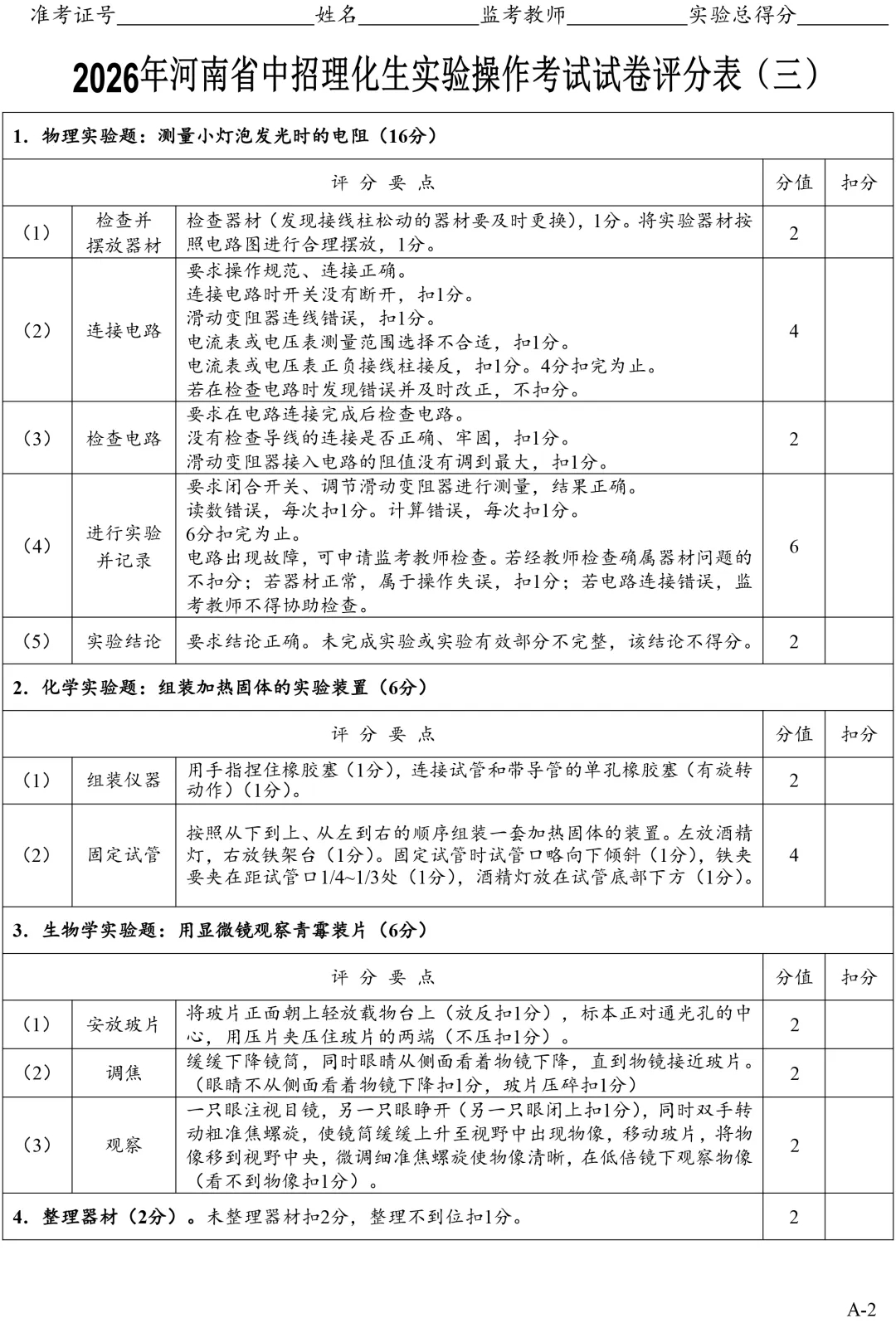 重磅!2025年河南省中招理化生实验操作考试试卷及评分标准出炉!