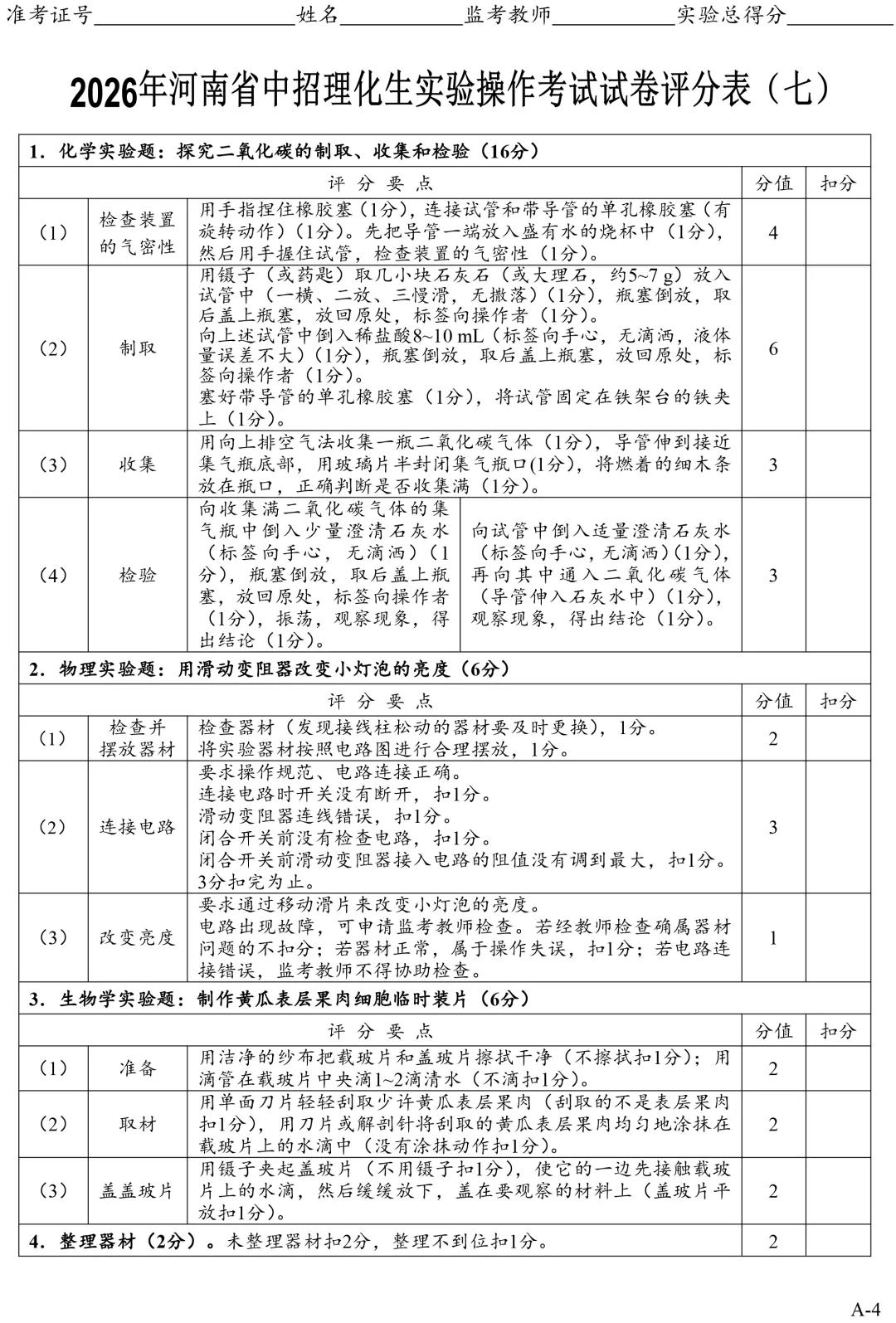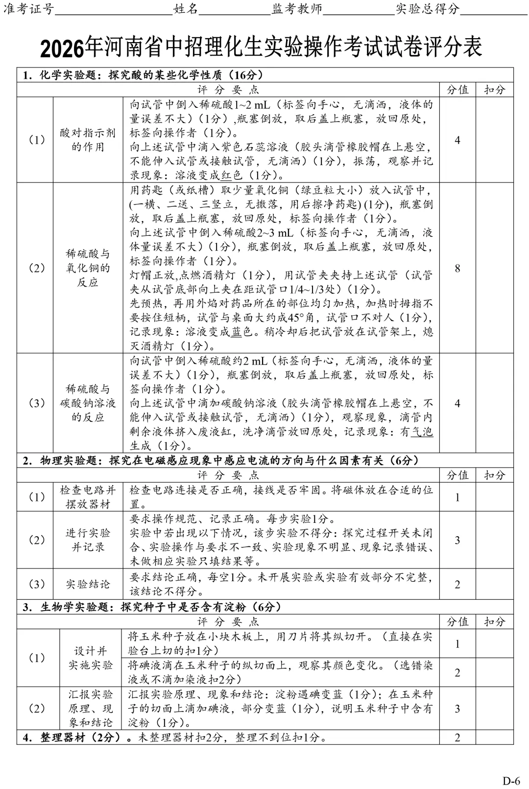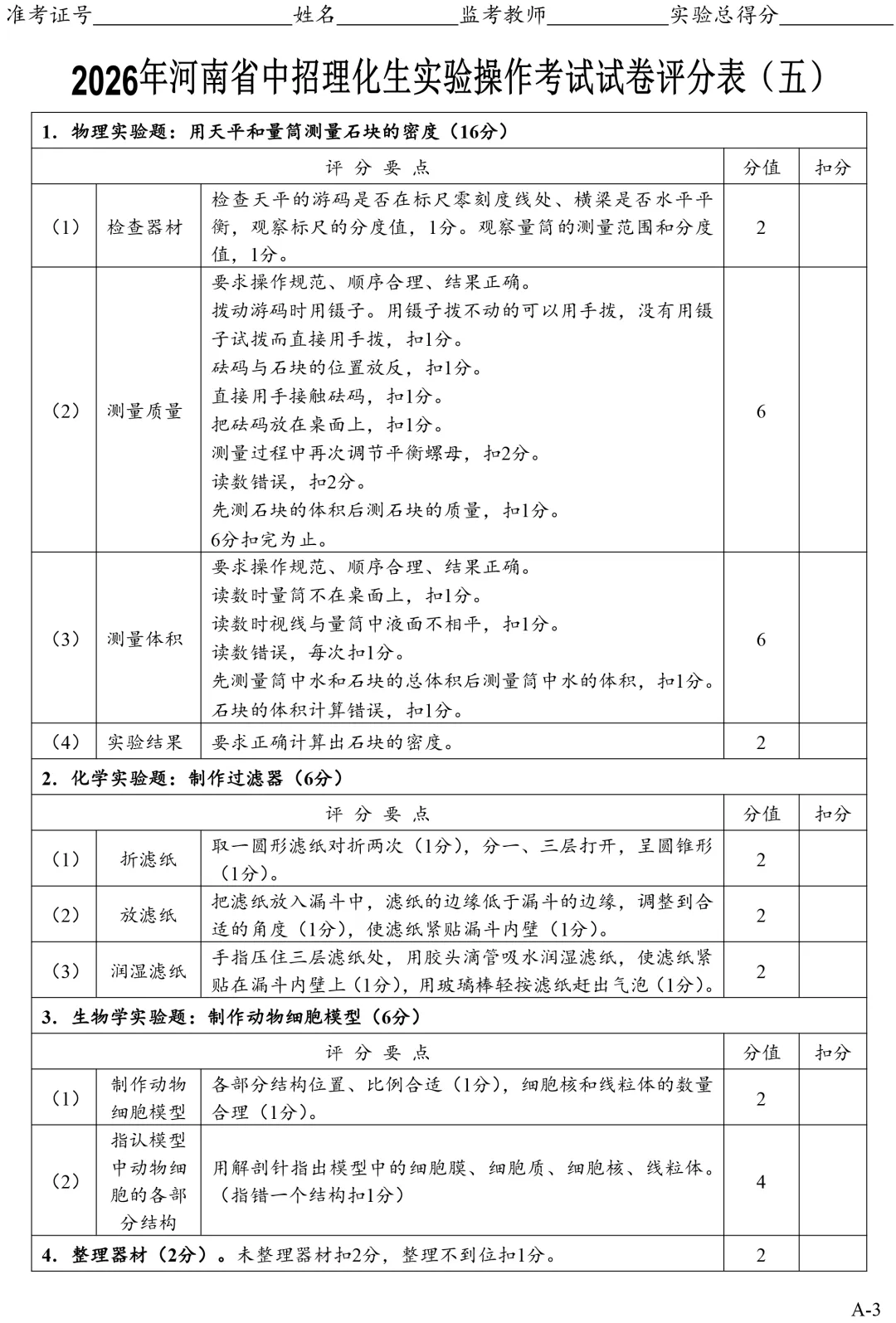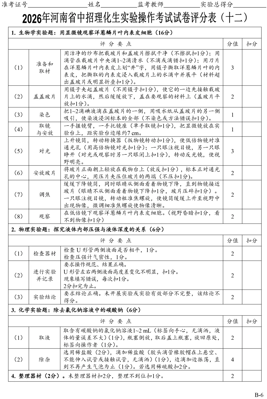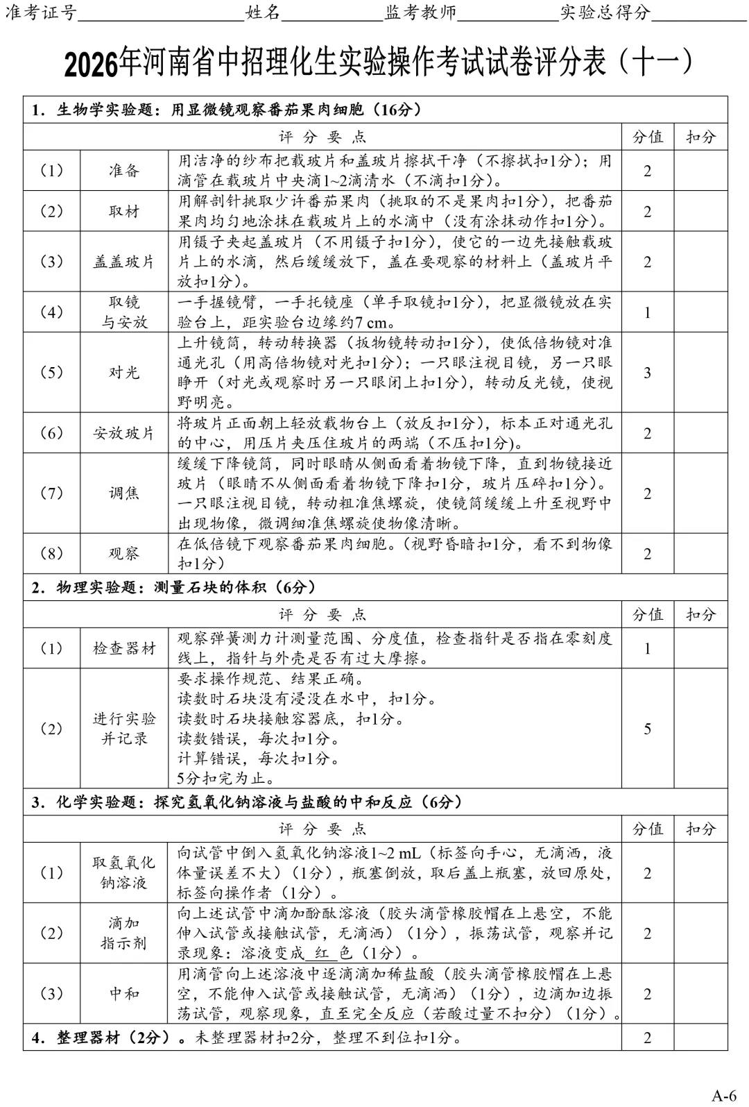 重磅!2025年河南省中招理化生实验操作考试试卷及评分标准出炉!