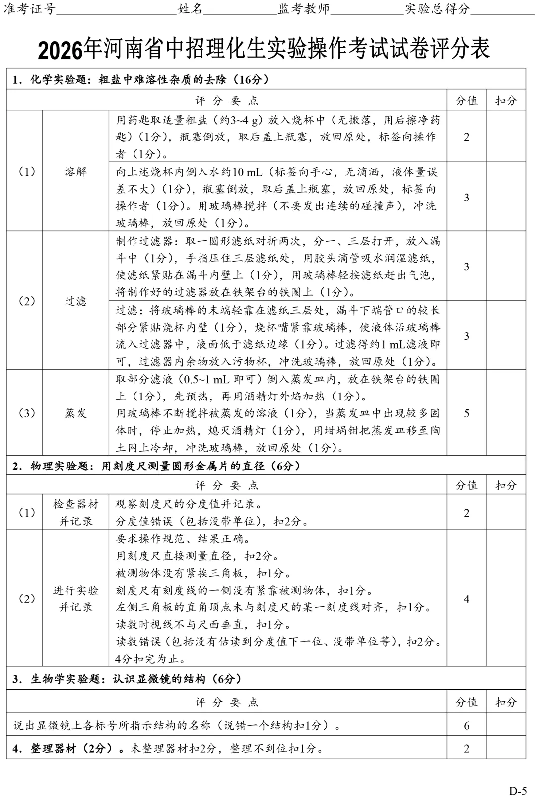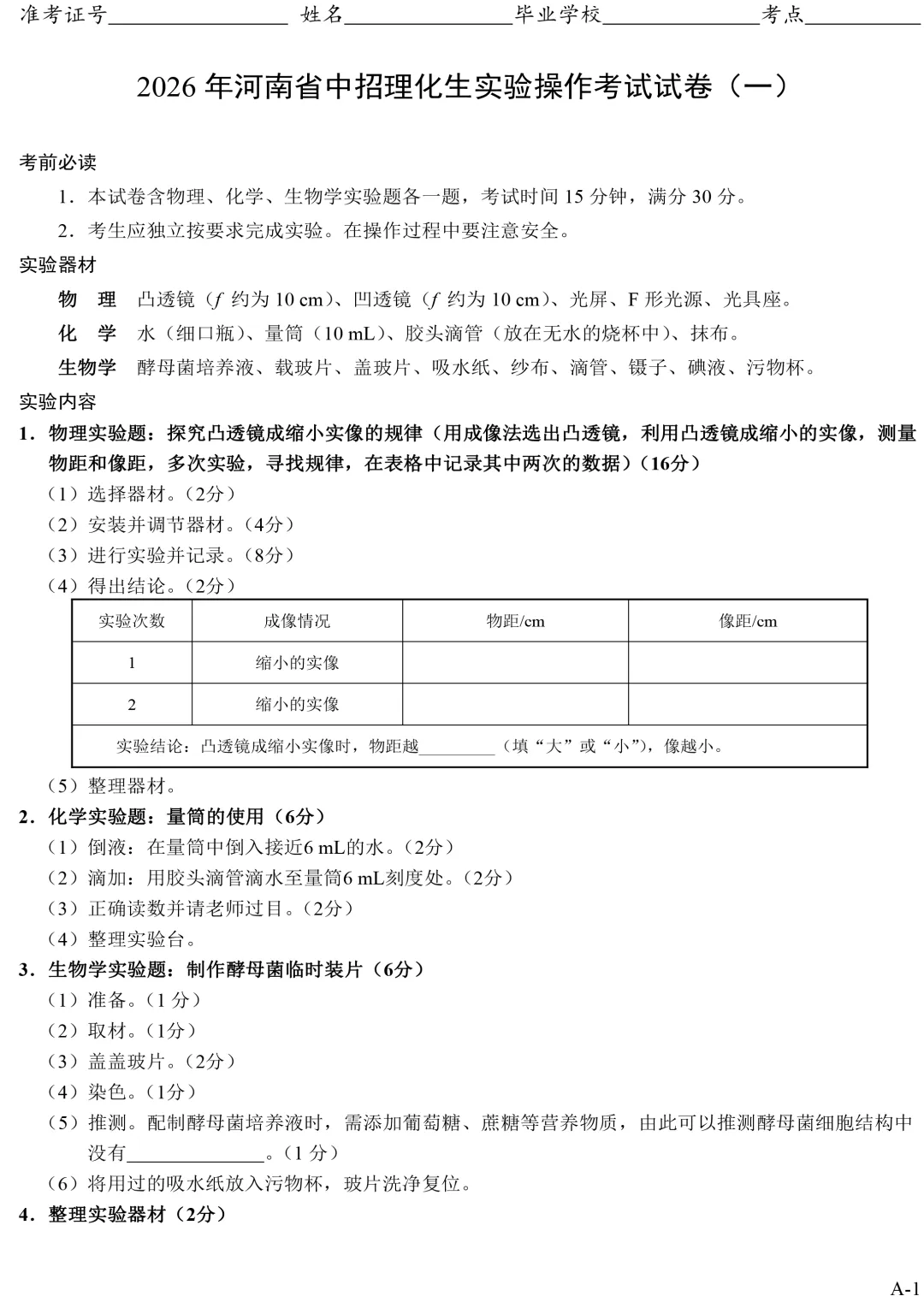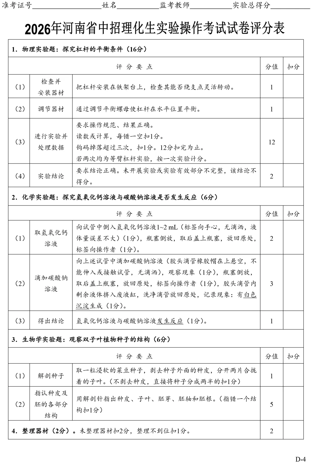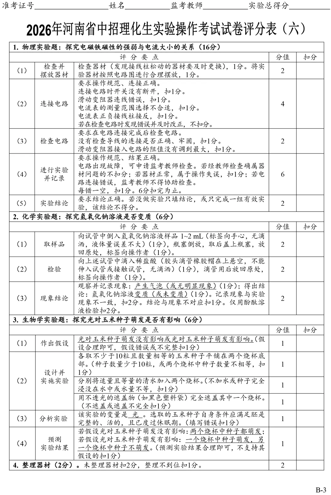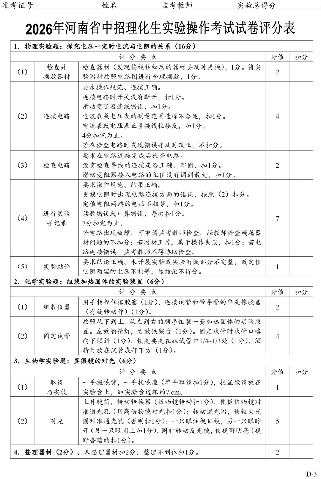 重磅!2025年河南省中招理化生实验操作考试试卷及评分标准出炉!