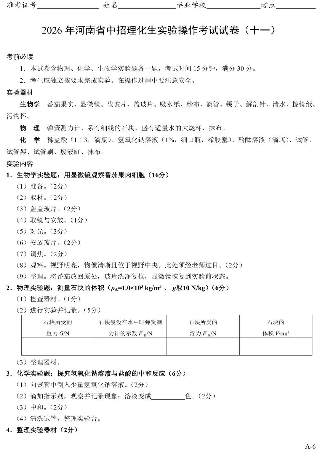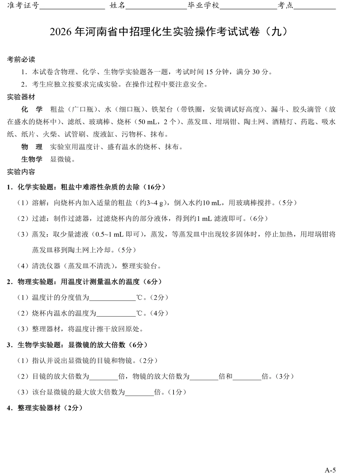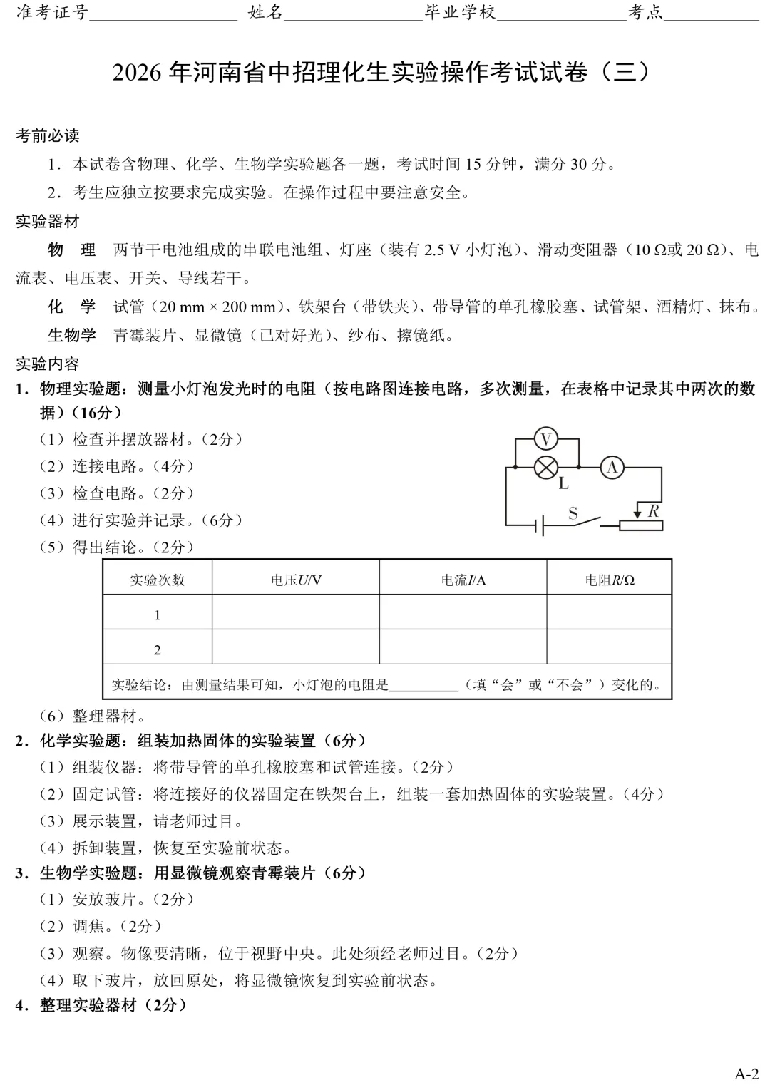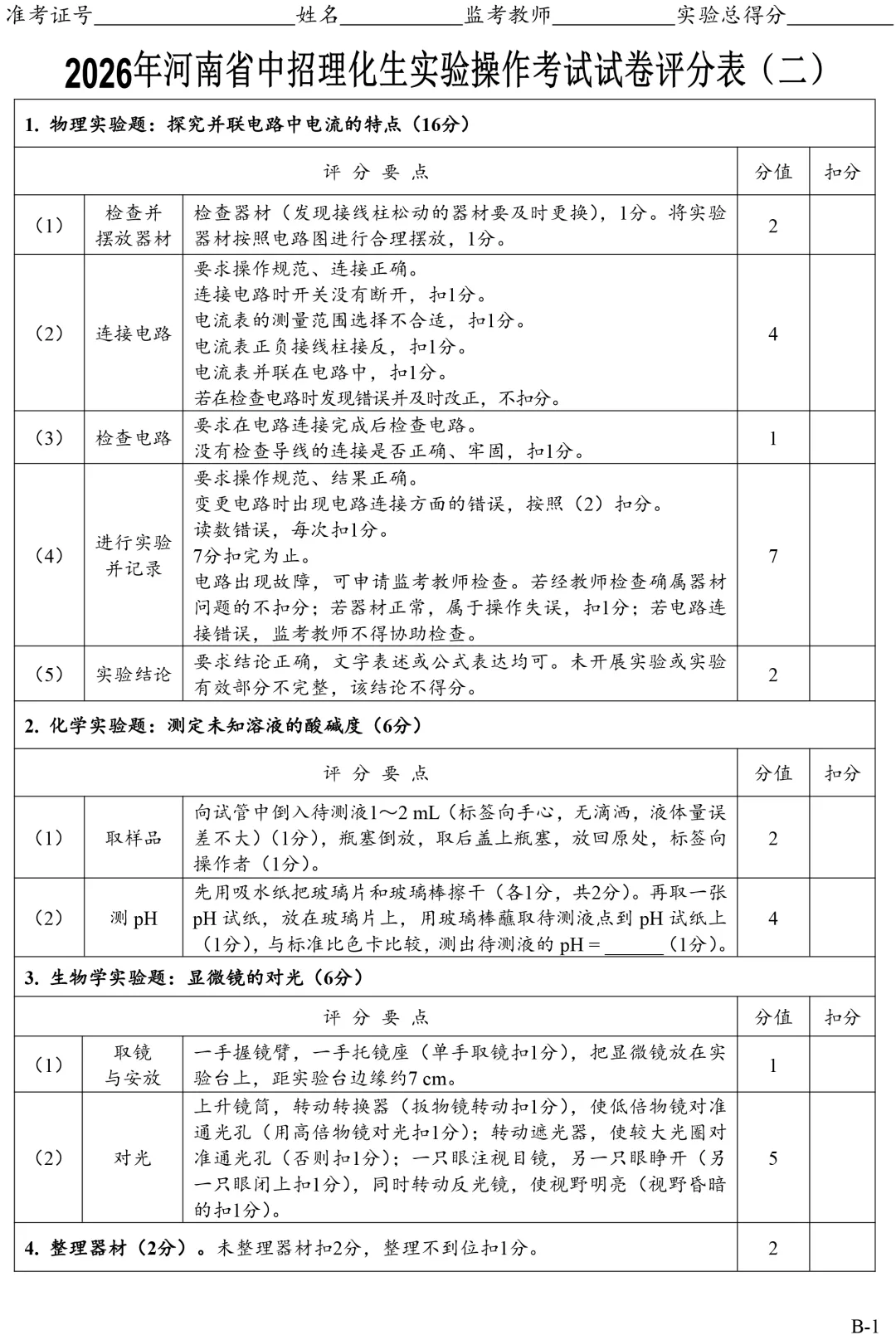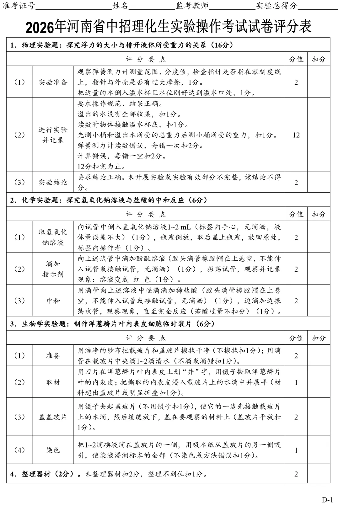 重磅!2025年河南省中招理化生实验操作考试试卷及评分标准出炉!