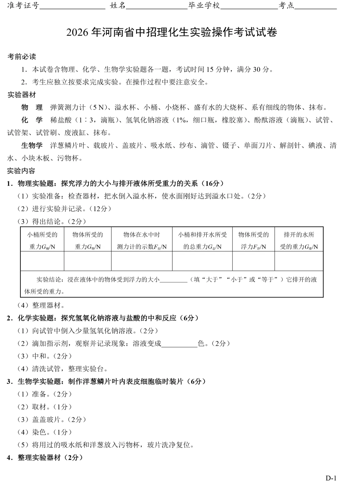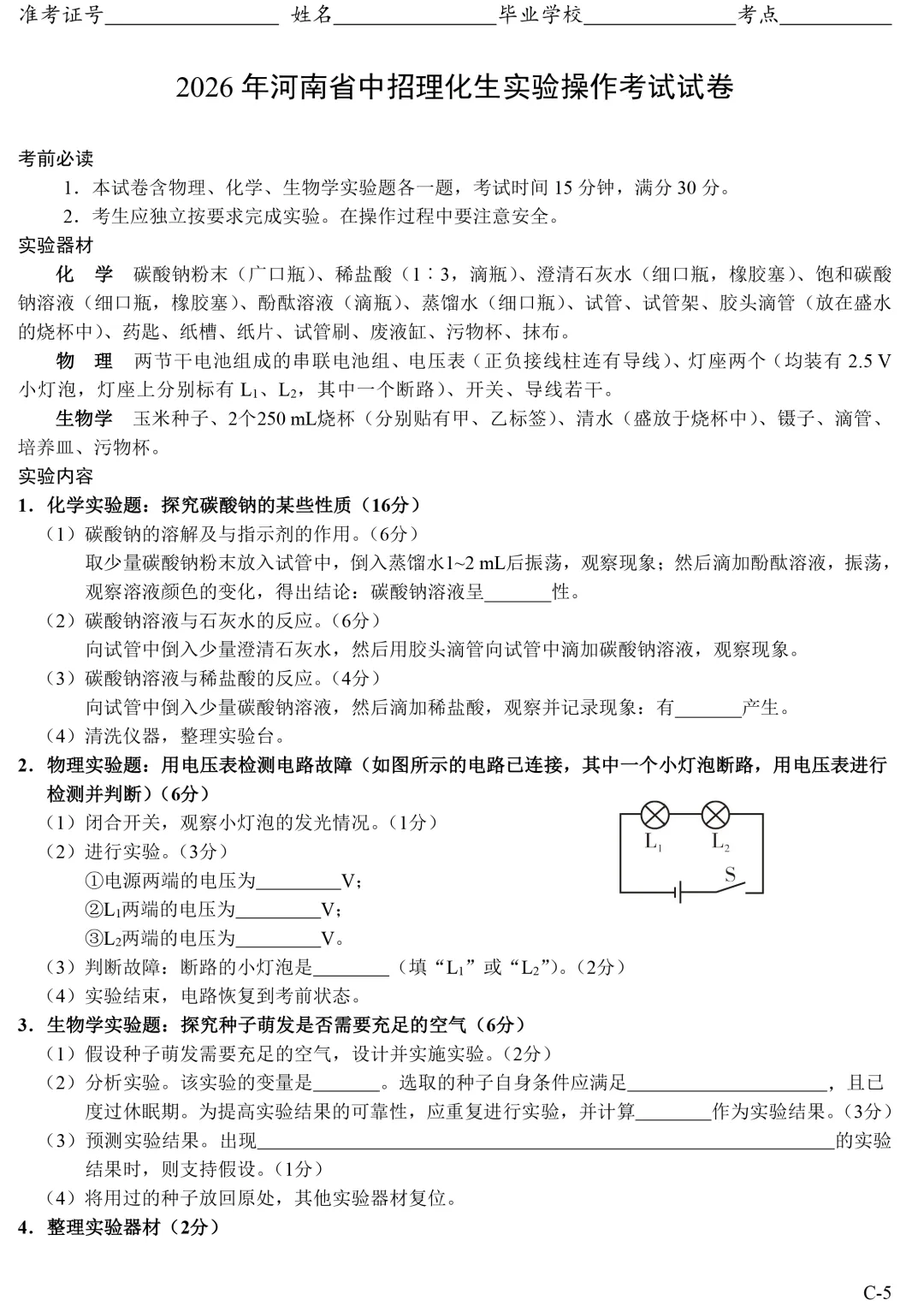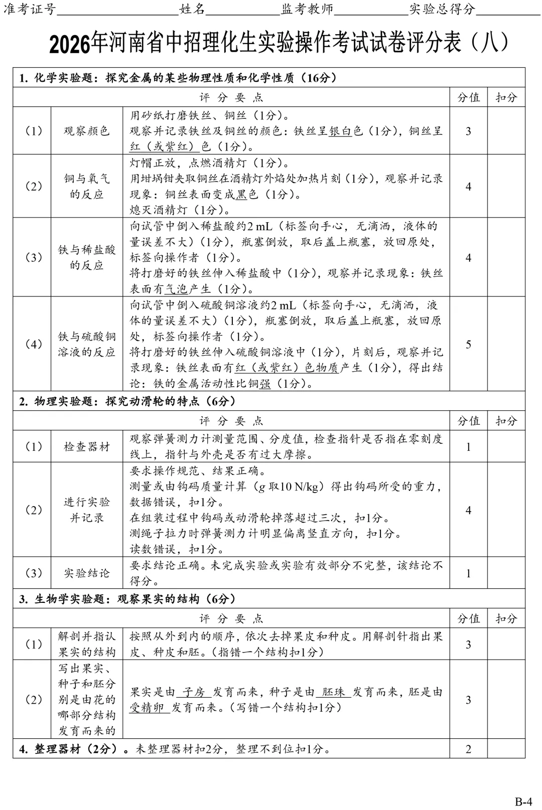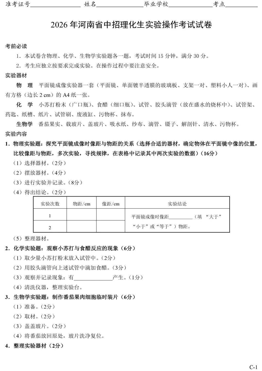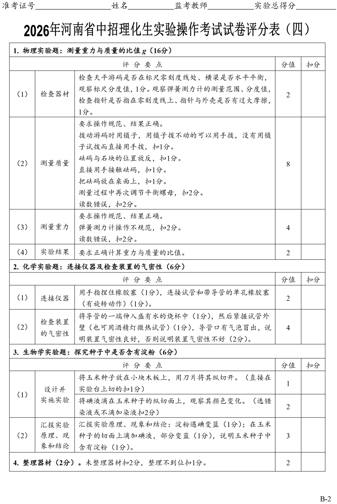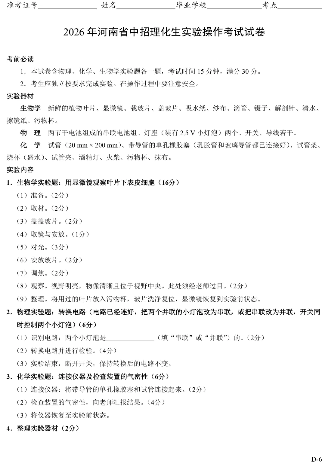 重磅!2025年河南省中招理化生实验操作考试试卷及评分标准出炉!