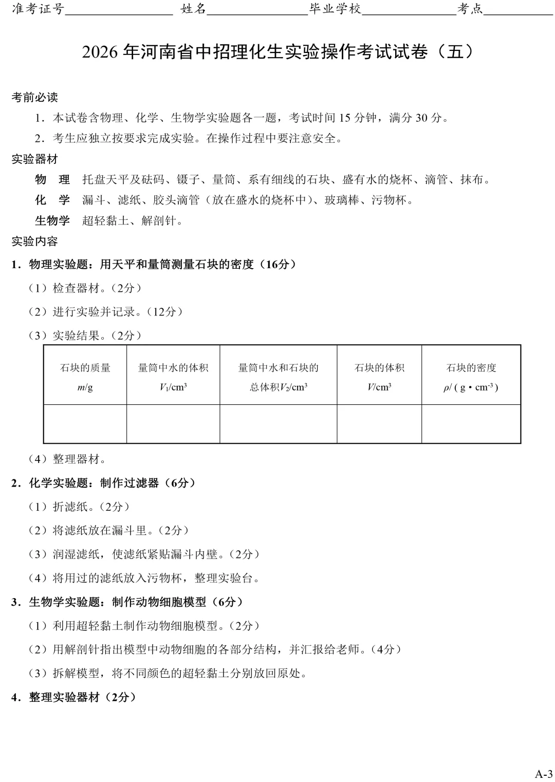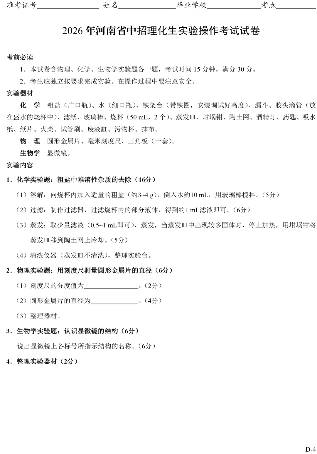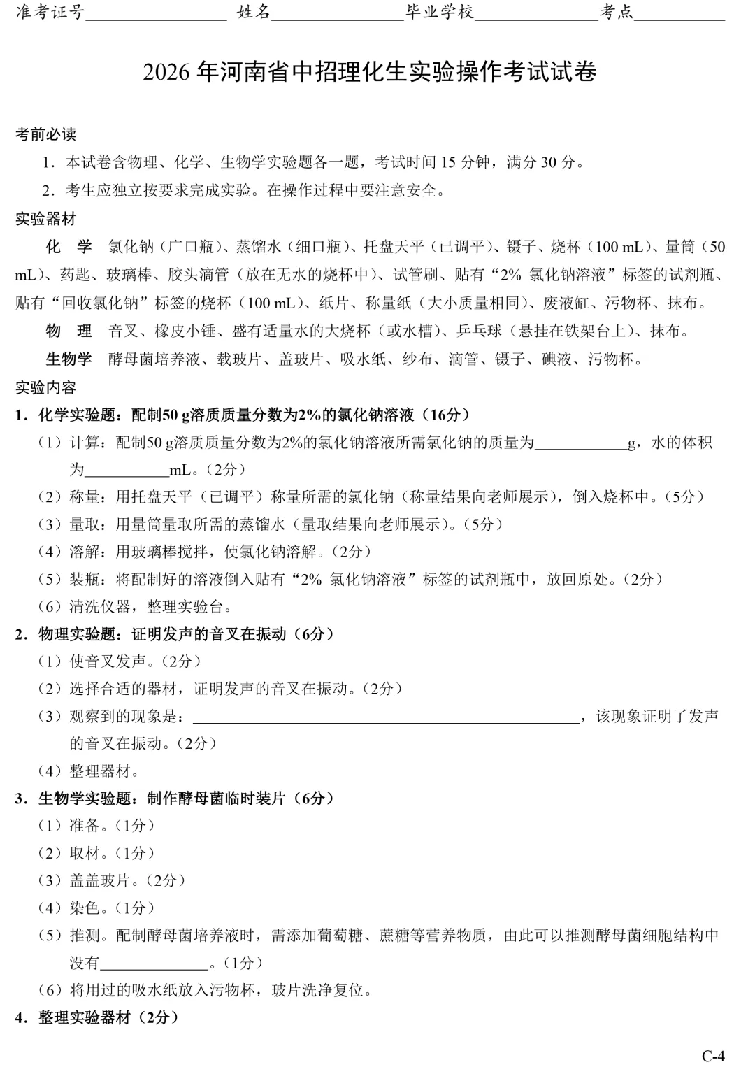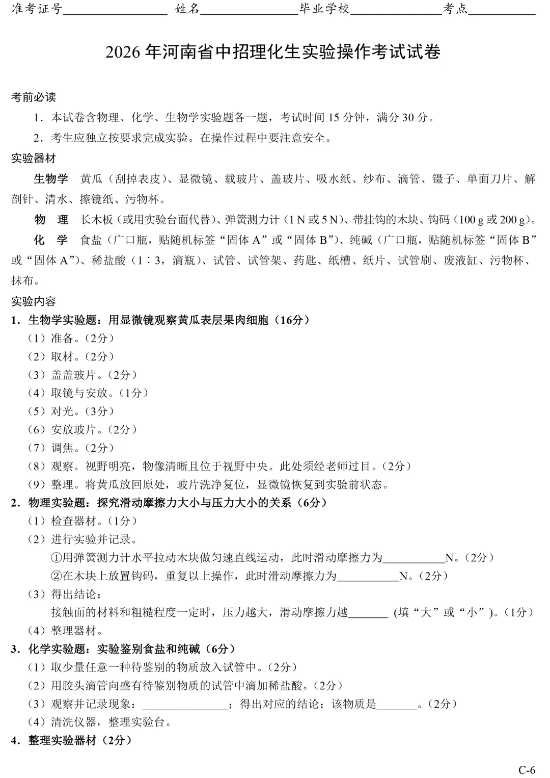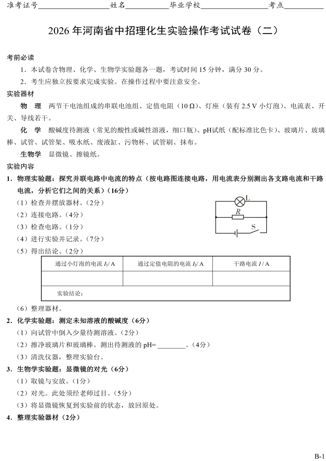 重磅!2025年河南省中招理化生实验操作考试试卷及评分标准出炉!