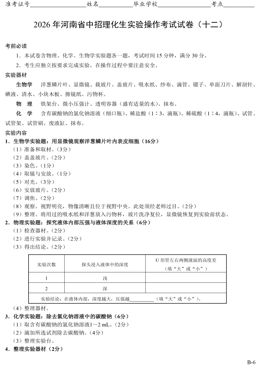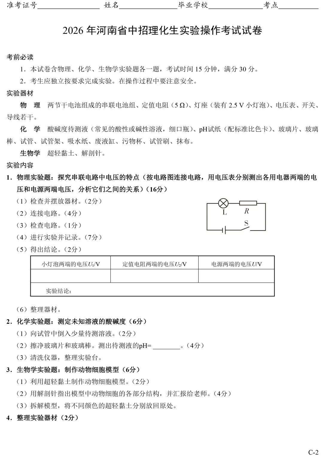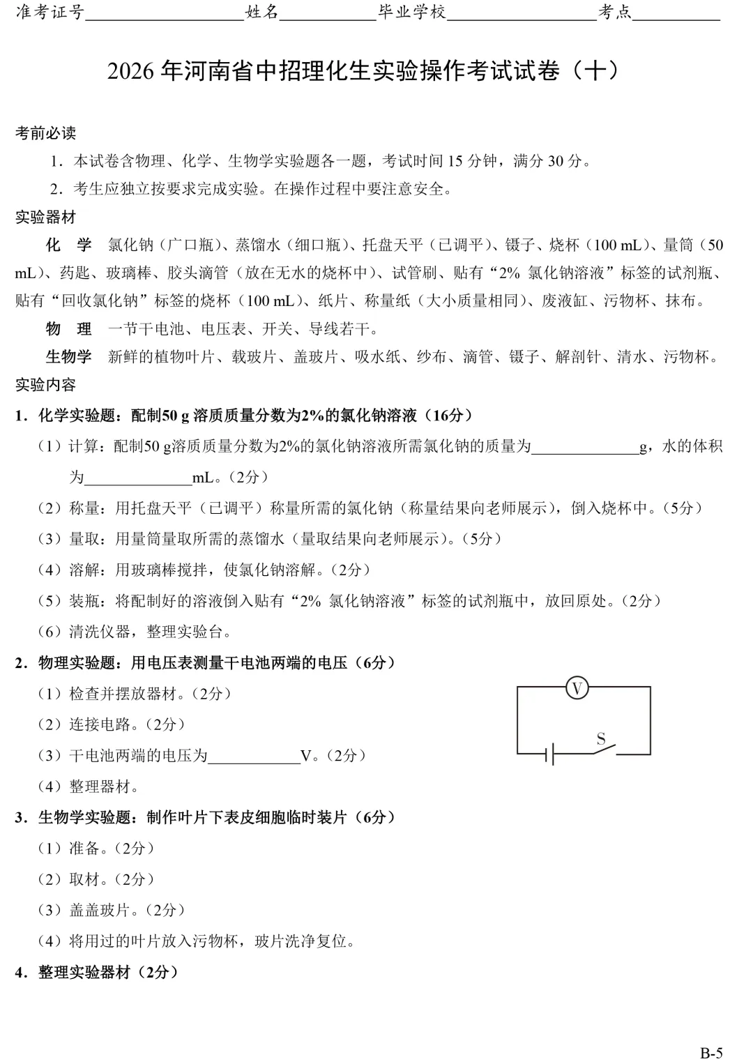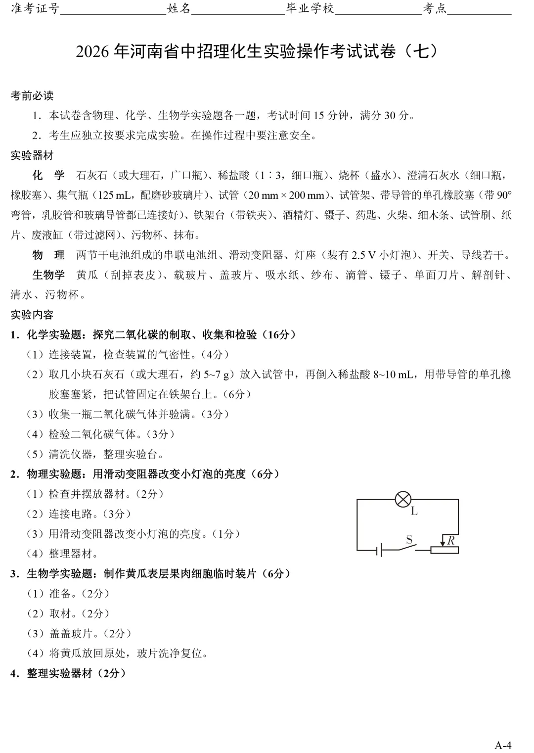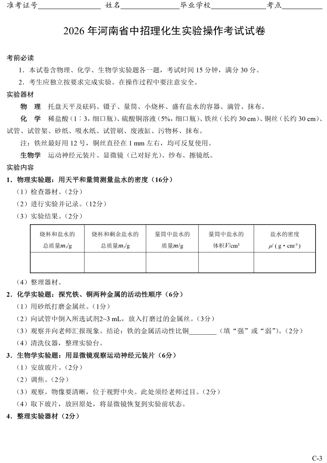 重磅!2025年河南省中招理化生实验操作考试试卷及评分标准出炉!