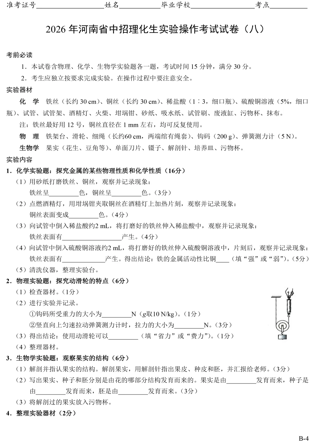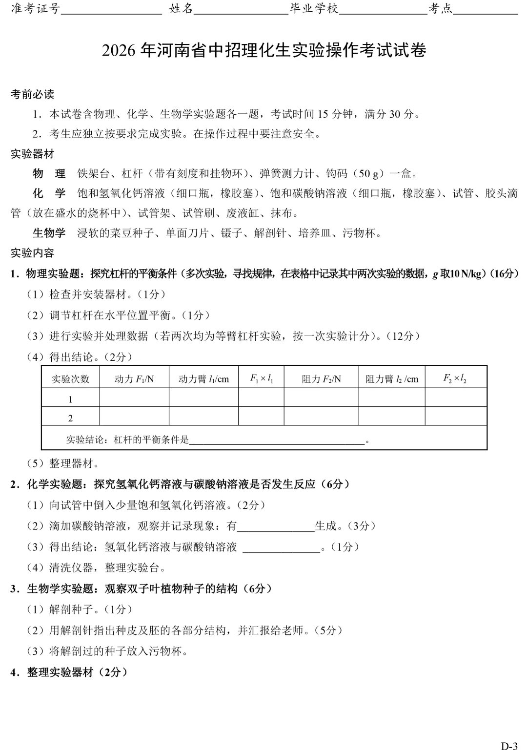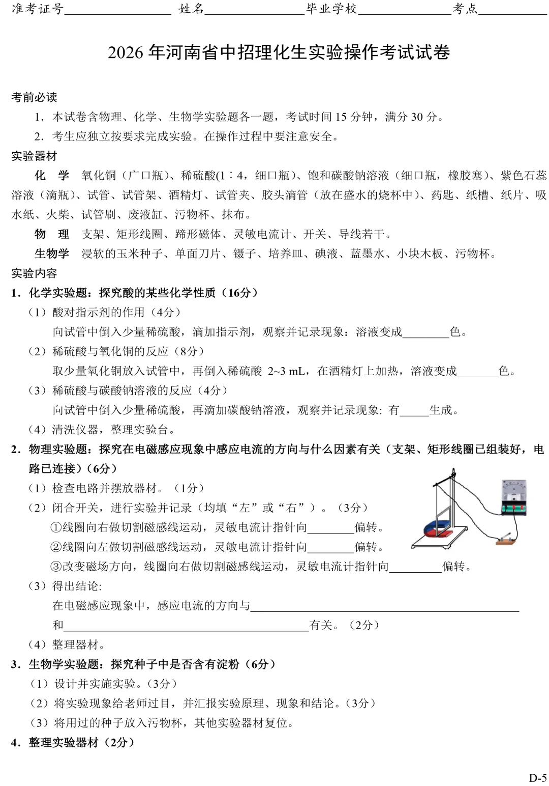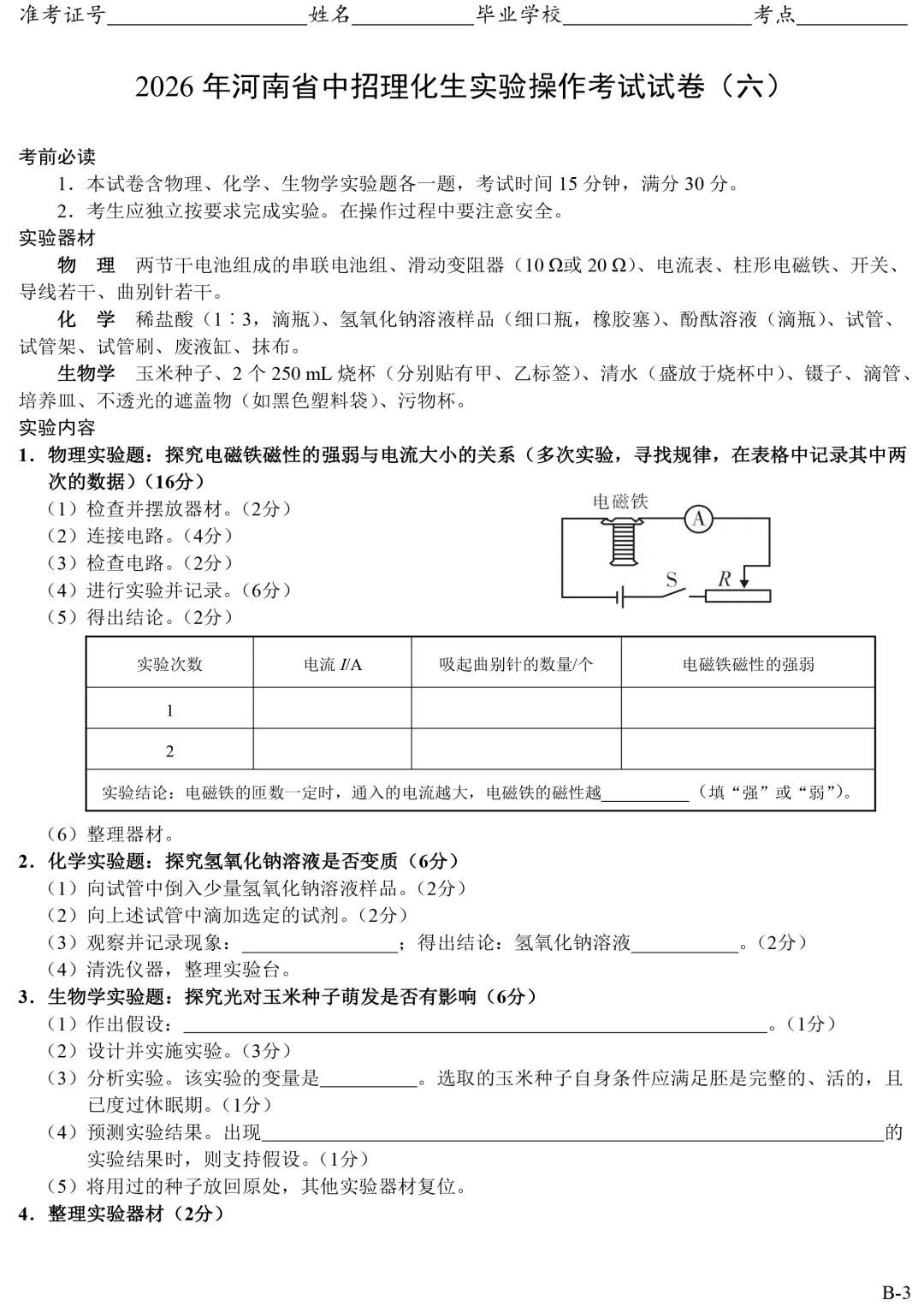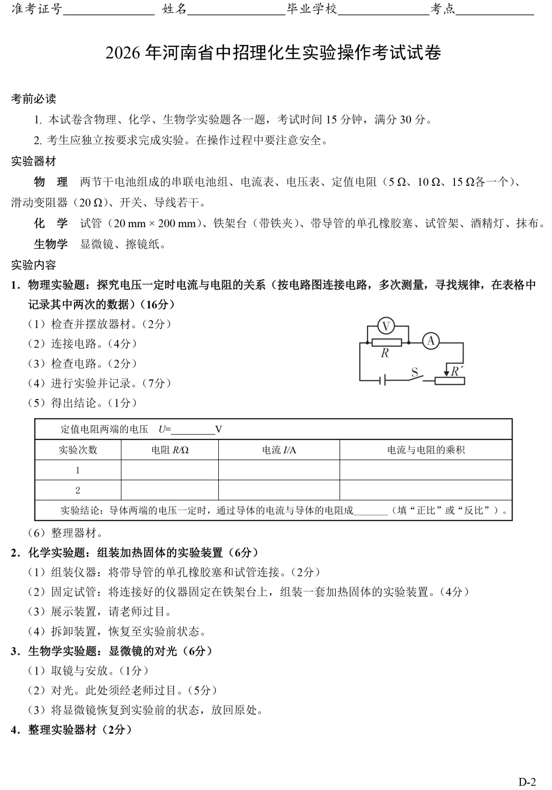 重磅!2025年河南省中招理化生实验操作考试试卷及评分标准出炉!